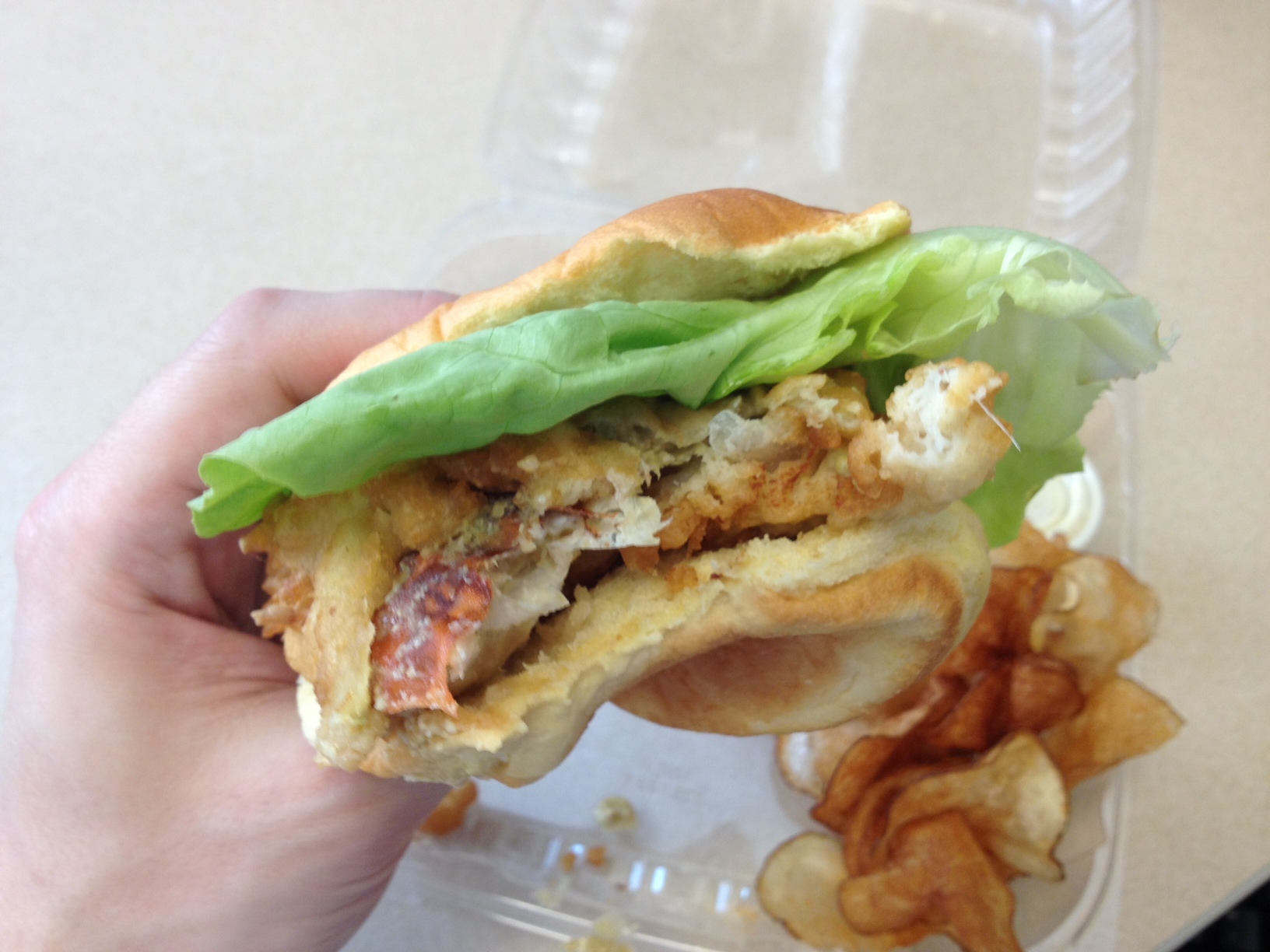 Where this baby really shines, though, is the remoulade sauce. To be perfectly honest, I wasn’t too familiar with the condiment before eating the sandwich, and I would have been convinced if someone had told me it was tartar sauce. According to Wikipedia, this is a fair comparison to make, the difference being that remoulade is commonly flavored with curry and can have diced pickles in it. Let me tell you, this stuff was essential to my enjoyment of the meal. Without any sauce, the sandwich would have been too dry and maybe a bit too plain. I had no trouble finishing up the small cup on the side, scooping it out with bread and potato chips. I wouldn’t complain if they had given me a bit more.