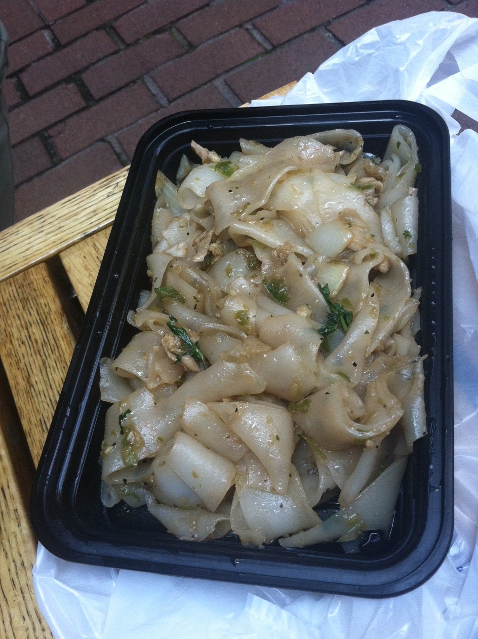 Pad Kee Mao (Drunken Noodles) with Chicken ($8). My friend got this, and I only had a bite, but it was a delicious, savory bite. These flat rice noodles are cooked with minced jalapenos in a mildly spicy basil sauce for a nice kick. MMMM.