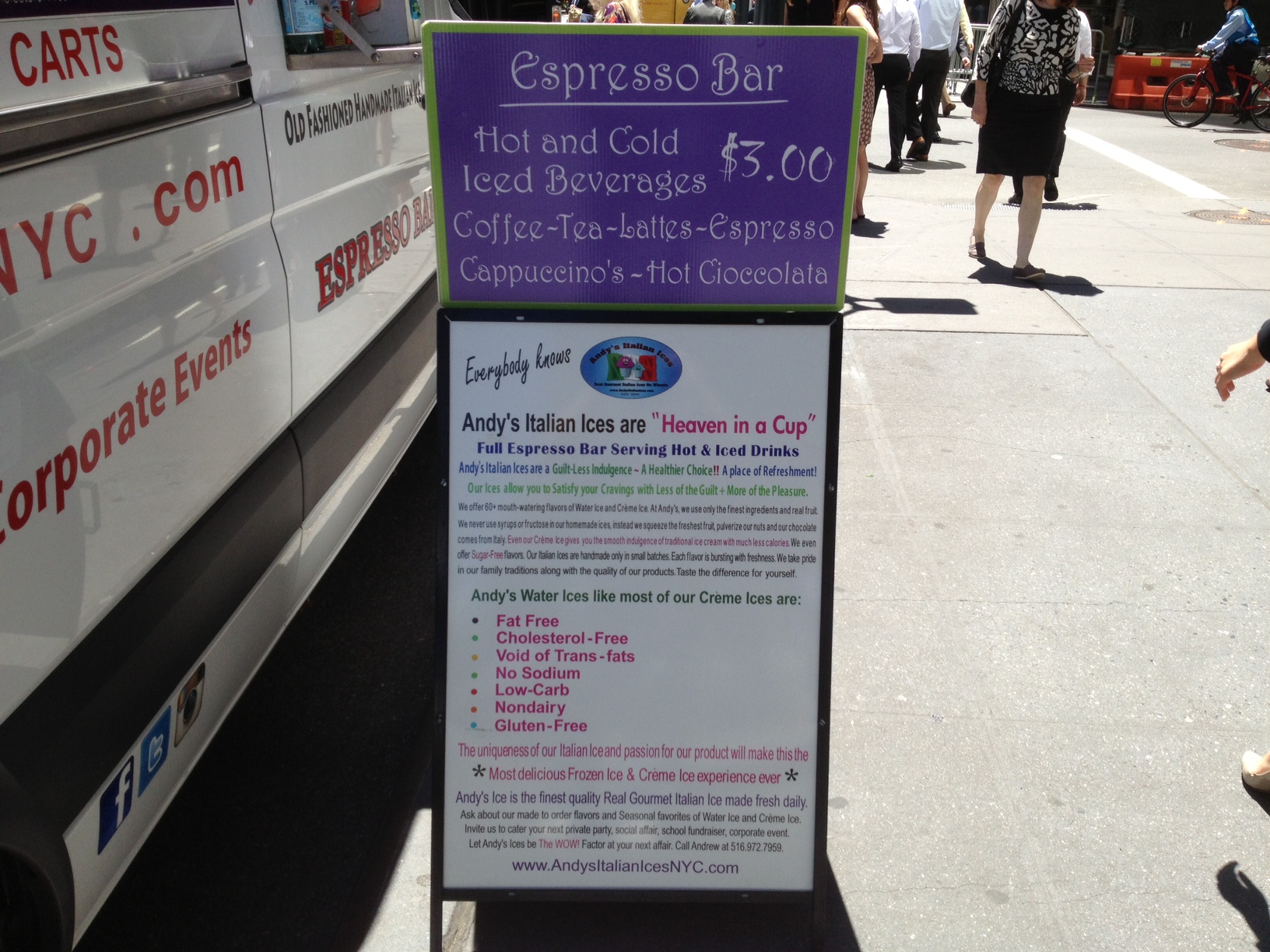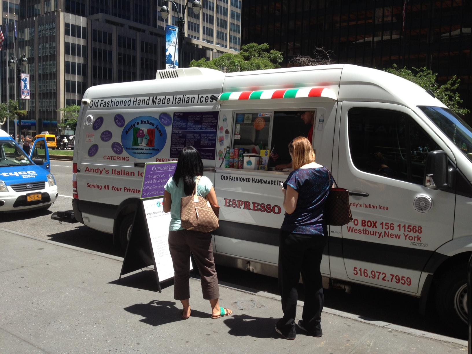 Yesterday, I noticed an unfamiliar dessert truck on Park Ave. between 52nd and 53rd Streets, Andy’s Italian Ices. The truck has been spotted downtown before, but I haven’t seen it around these parts until now. They pride themselves on their large variety of Italian ice flavors, a healthier and “guilt-less” indulgence. They’ve got 45+ flavors in water ice, crème ice, and sugar-free ice varieties, plus a good deal of hot and cold caffeinated beverages.