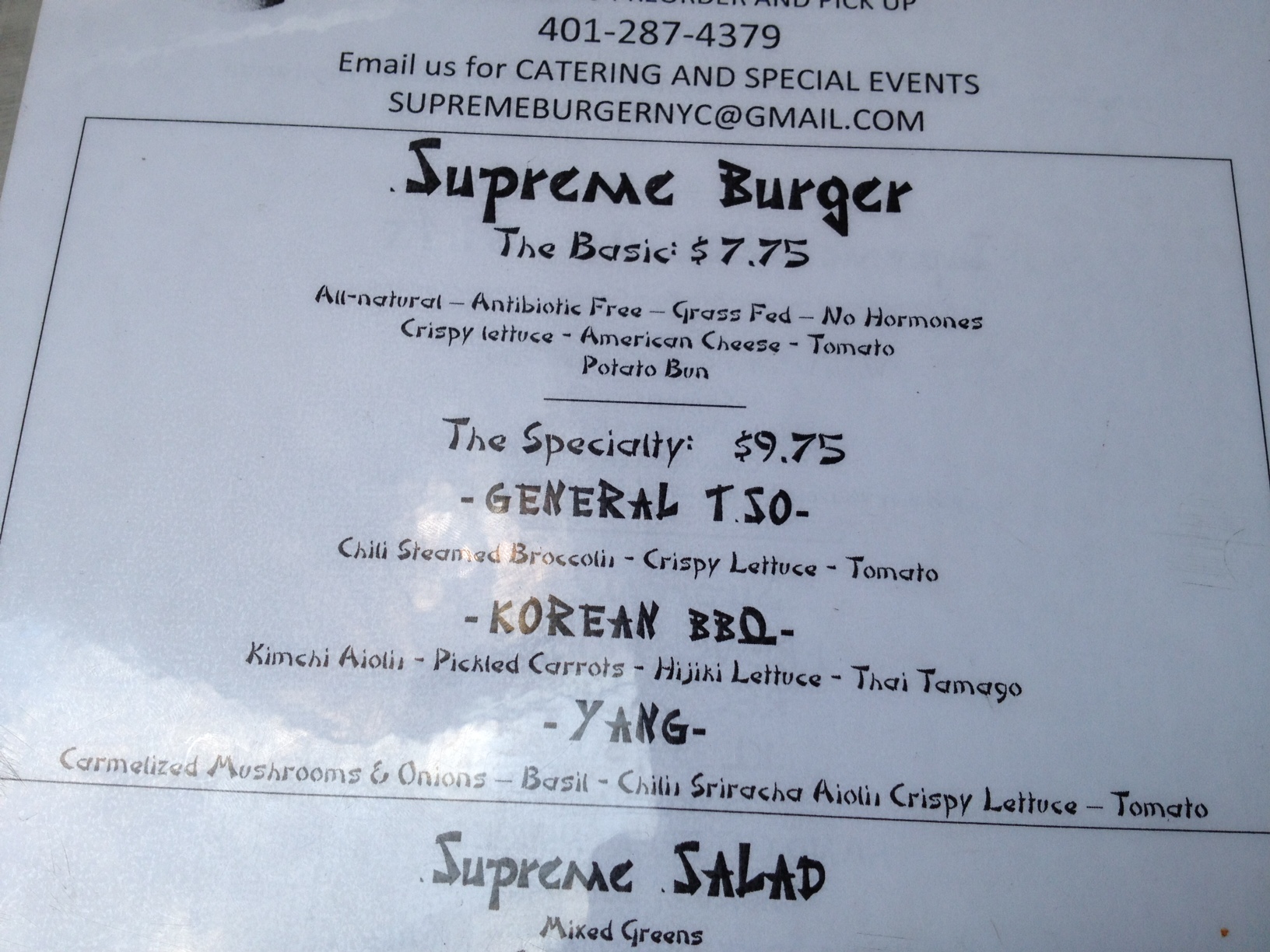 As reported last week, the Rhong-Tiam Supreme Burger Truck has been parking at 47th Street and Vanderbilt along with a whole bunch of other food trucks. I finally got the chance on Tuesday to stop by and check it out myself. Interestingly, the full menu painted on the side of the truck is covered up with a few printed copies of a smaller, limited menu. I’m not sure if they’re in a trial phase or if the full menu has already been scaled back, but there are still plenty of options available, including burritos, rice bowls, empanadas, and salads. Given that the truck is named after their “supreme” burgers, I figured that ordering a burger was the way to go.