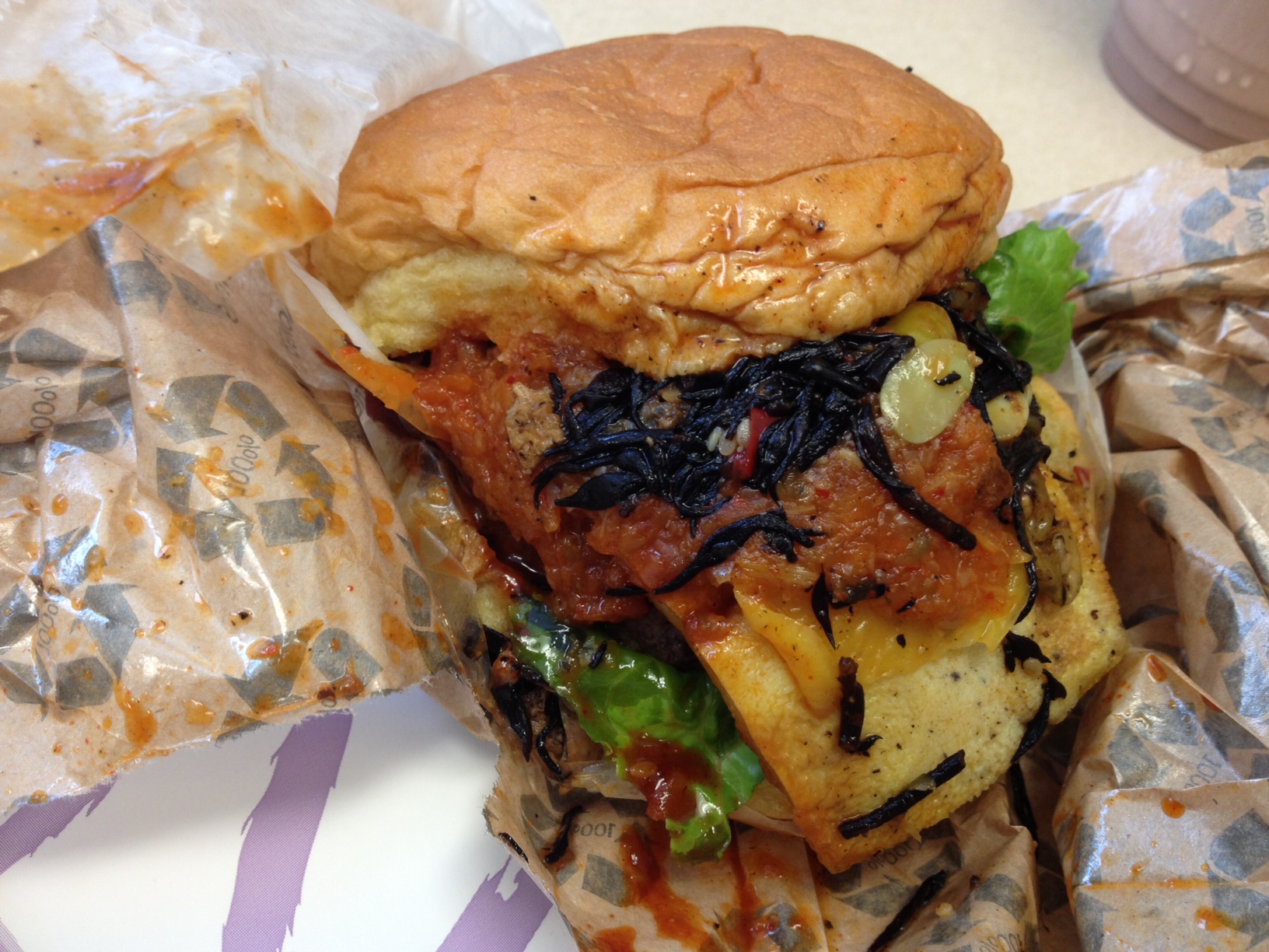 Back in the day, I had fallen in love with the Bibimbap Burger at Social Eatz (RIP), so the idea of an Asian fusion burger really appealed to me. After some deliberation, I ordered the Korean BBQ burger ($9.75), which has kimchi aioli, pickled carrots, hijiki lettuce, and Thai tamago. I also got a small order of fries with a spicy honey mayo sauce ($3.50) and a chocolate milkshake ($6.00). There wasn’t much of wait at all to place my order, but it took just under ten minutes before the food was ready.