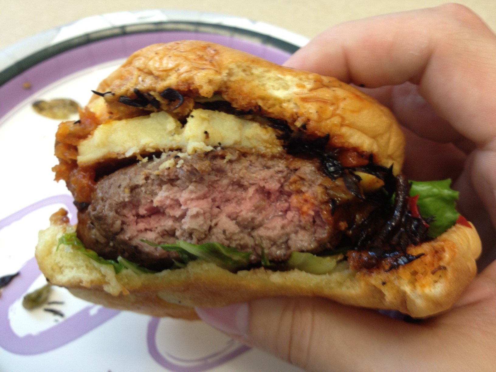 As you can see, there was a lot of stuff on this thing… more than I expected anyways. My hands definitely got messy holding the burger, but everything stayed together surprisingly well. The burger patty itself was a little smaller than I had hoped, but it was plenty filling all the same, so I can’t really complain. The beef – slightly charred on the outside, but cooked to an appealing, mildly pink medium on the inside – was pretty fantastic. It wasn’t spiced in a particularly noticeable way, but it was juicy and texturally pleasing.
