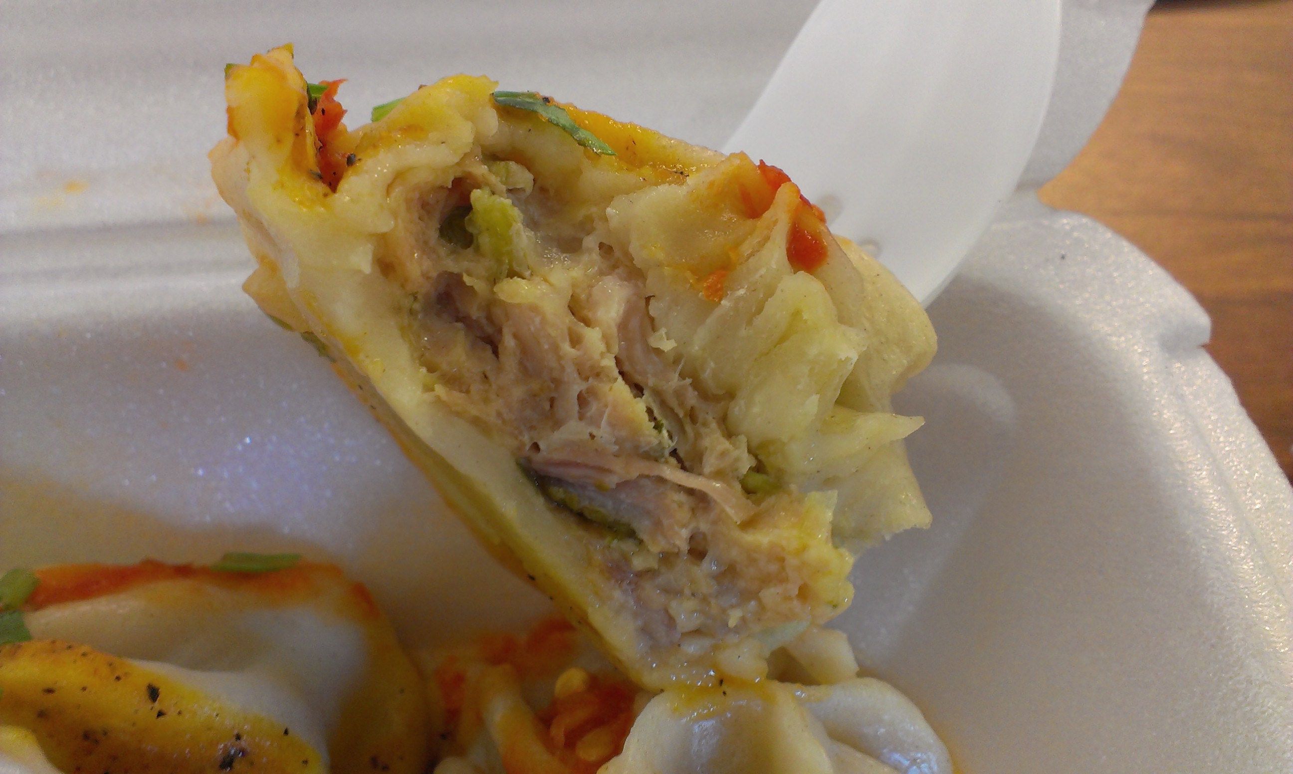 I chose the chicken, and was blown away. The round dumplings were doused in squirts of hot sauce and a yellow sauce, which the internet tells me might be a sesame momo sauce, and covered in chopped cilantro. Inside each round dumpling was a mixture of moist chicken and herbs.