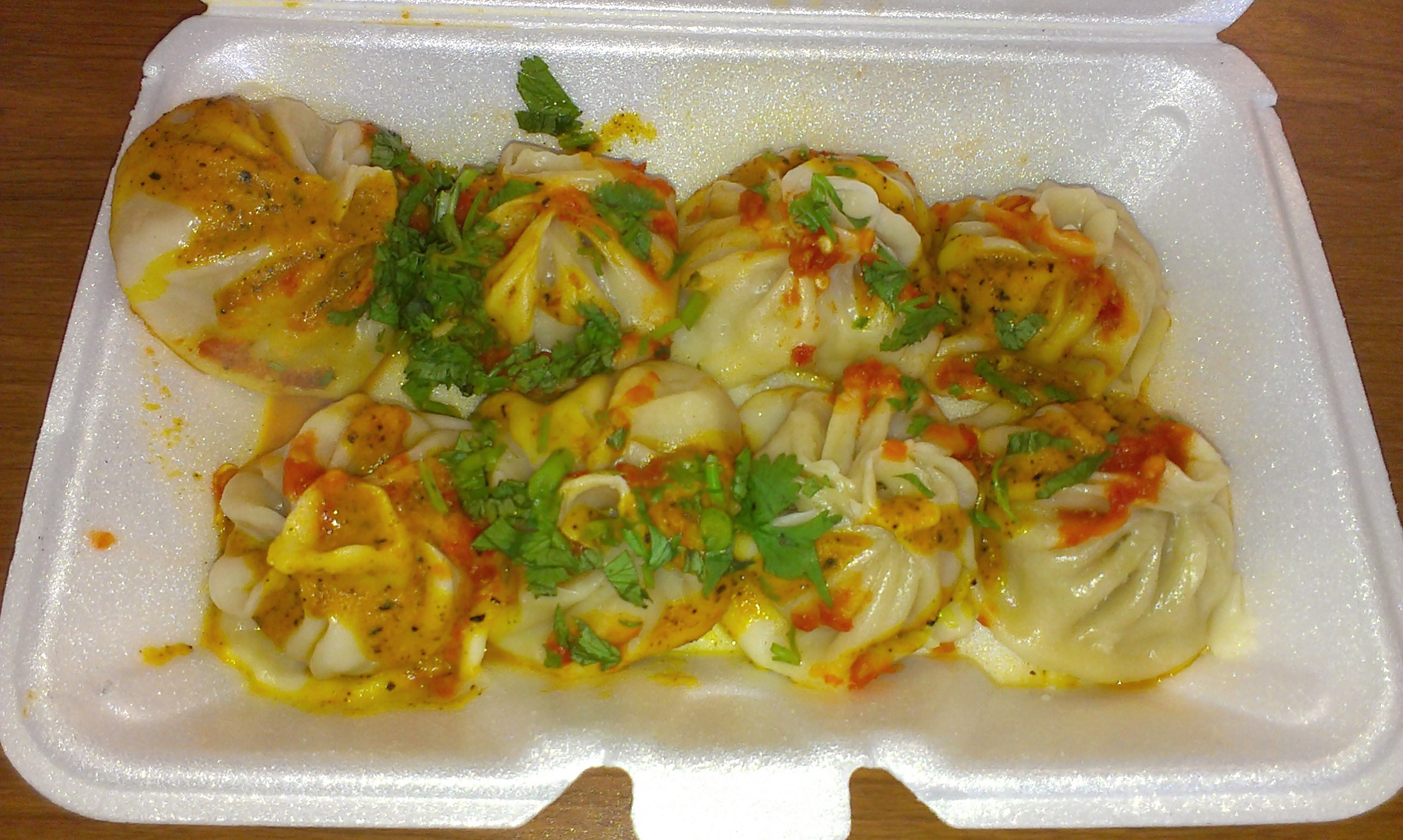 The chicken is not ground, as in some dumpling, but chopped into small pieces, leaving its texture intact. Combined with the yellow sauce, the momos tasted like a fusion of Indian and Chinese flavors, which is a very good thing.