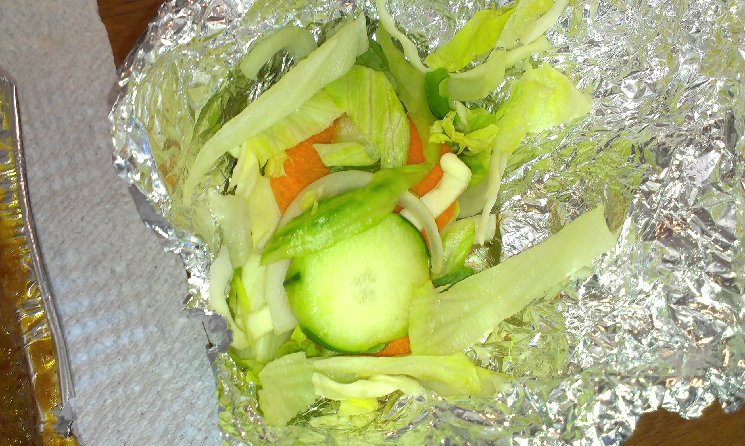 I was also disappointed to see that a foil-wrapped item in my bag wasn’t naan, but a small salad (my fault for not looking closely at the menu), and a pretty meager one at that.