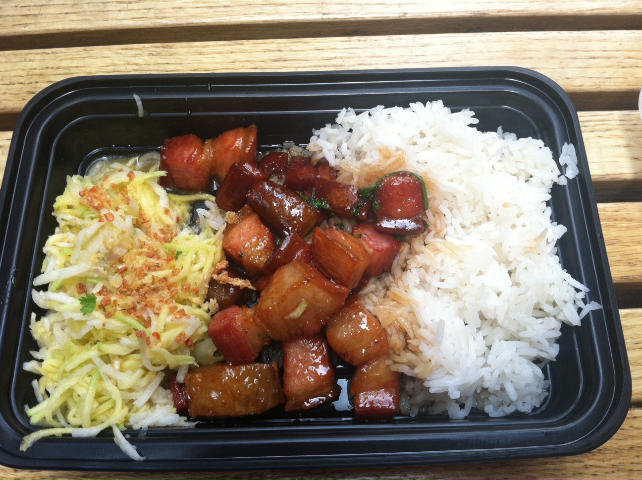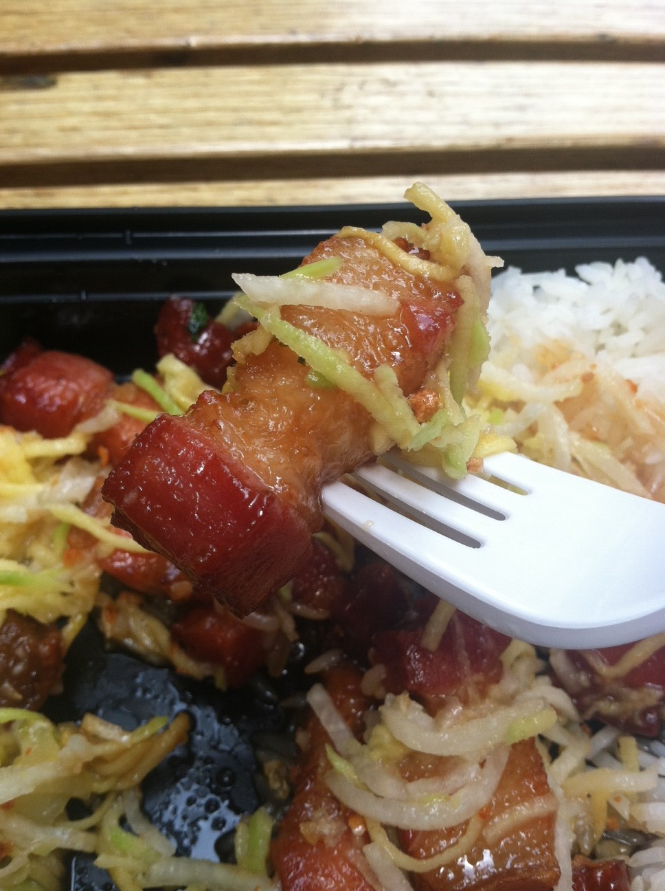 I’m not even sure if I’ve ordered pork belly anywhere for lunch in Midtown, so this was already a treat for me. There was a good mix between fatty pieces and more meaty crunchy pieces, all seared on the ends and tossed in a sweet glaze. I actually didn’t think the sauce was that spicy – the salad seemed spicier – and I ended up mixing my whole plate together to spoon in pork, salad, and rice all at the same time.