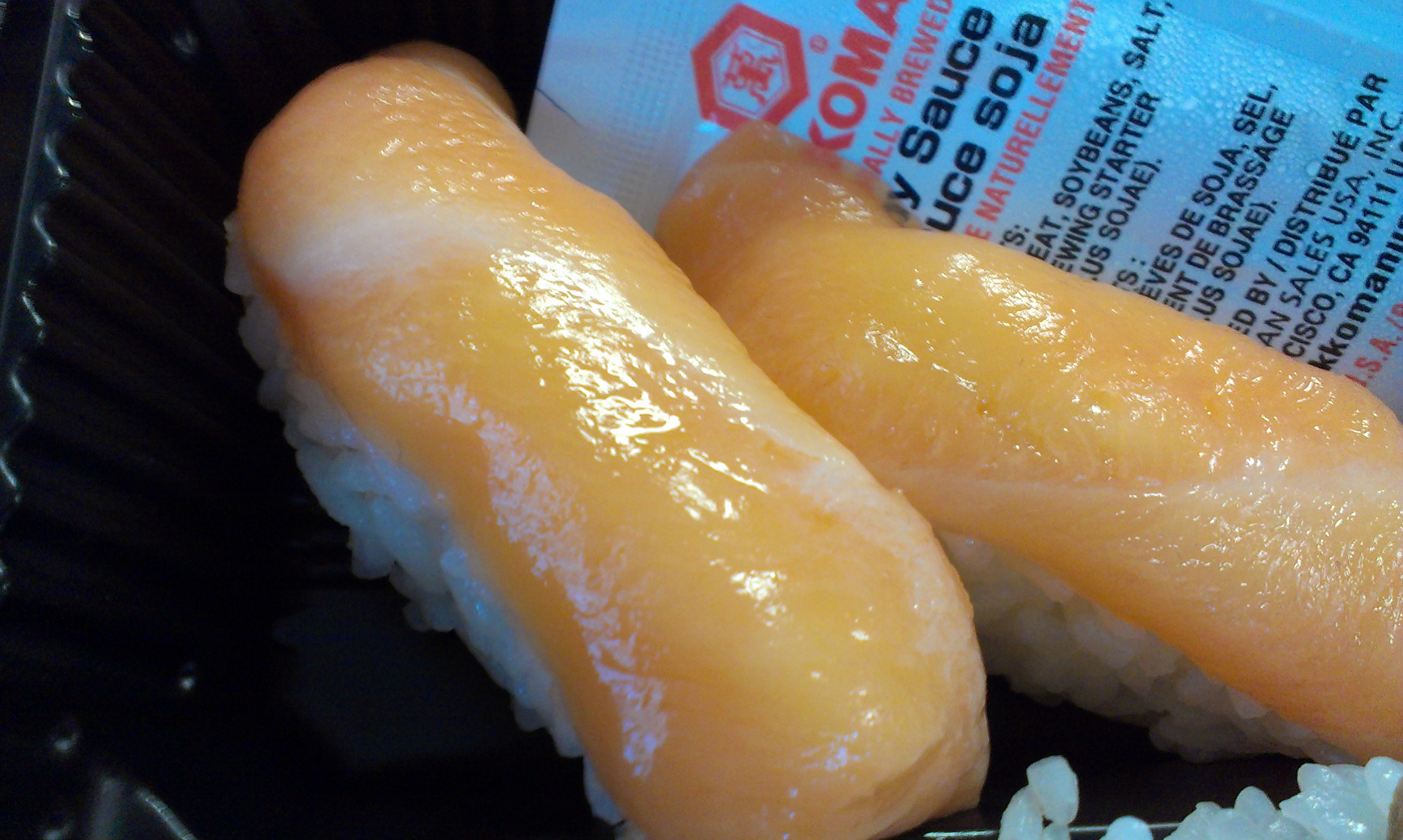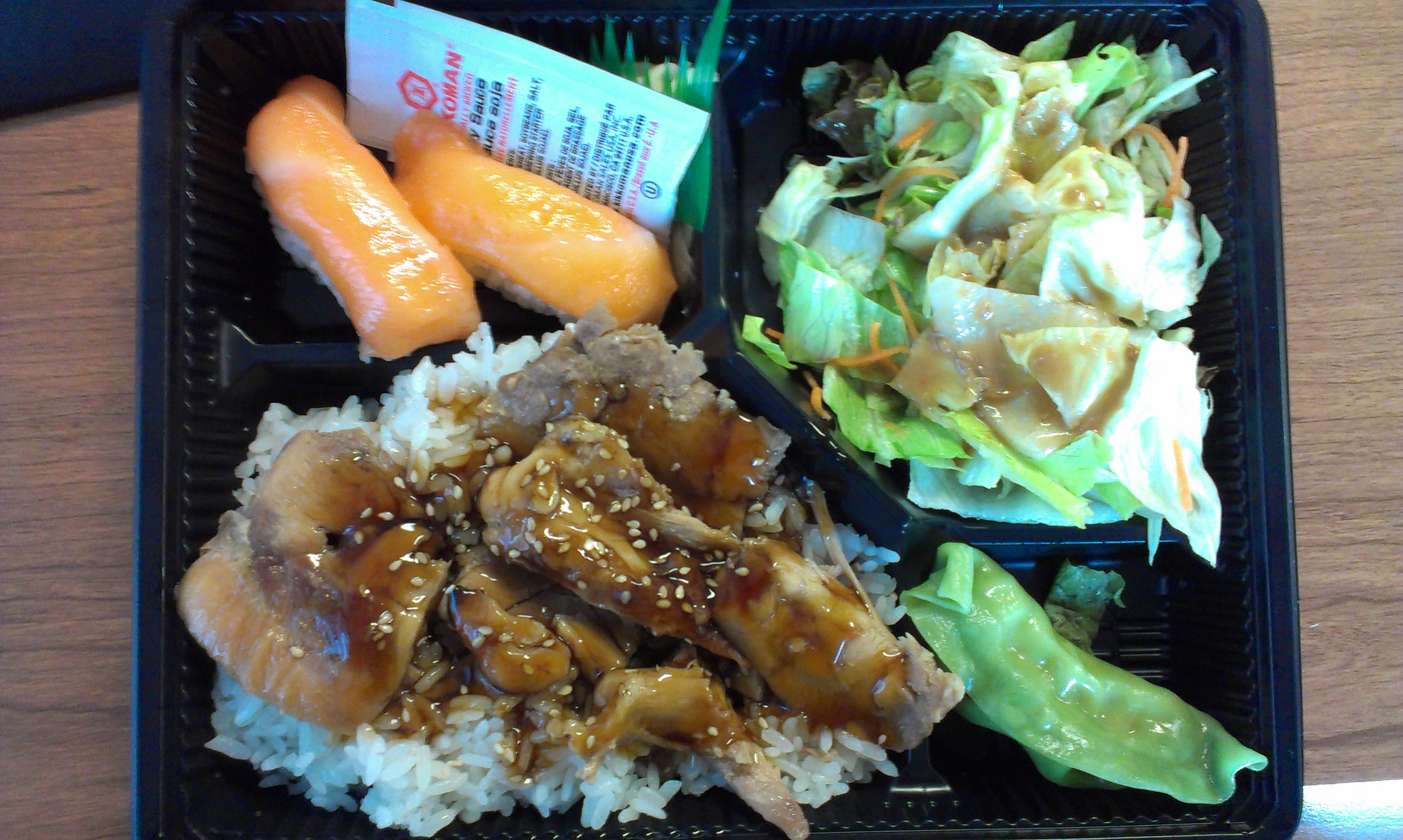 And what about the sushi? I thought the salmon was pretty good, although it also felt maybe just a bit mushy. Still, for a place where the sushi comes in plastic, it wasn’t bad. I especially liked Bento’s soy sauce, which is specially made for them by Kikkoman. It’s a bit sweeter than traditional Japanese soy.