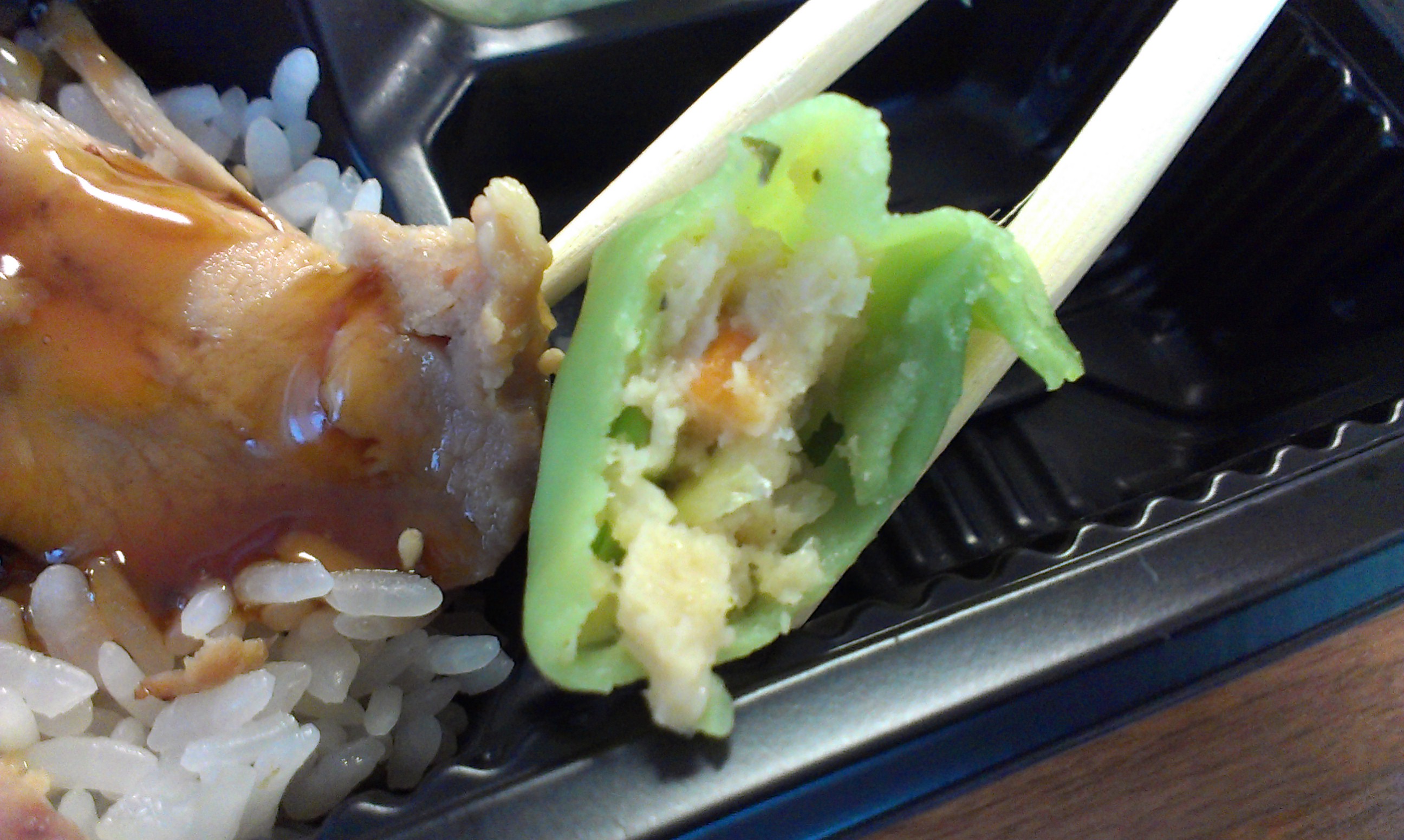The salad, mostly lettuce and shredded carrot, was actually the most flavorful item in the box, thanks to a nice dressing that tasted of ginger and soy.