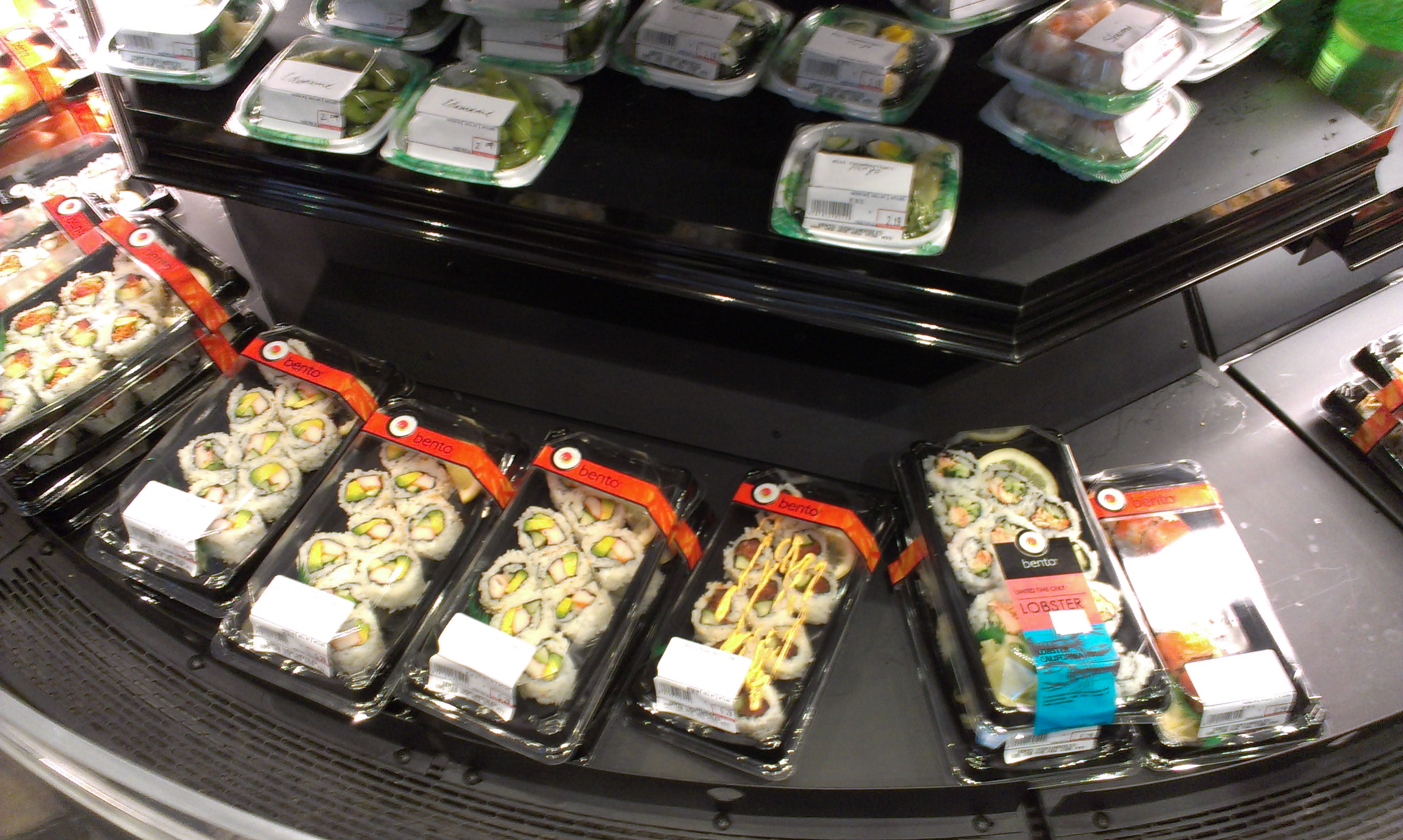 As far as Bento’s other sushi offerings, there’s a good variety, but it’s definitely sushi for North American palates. You won’t find much that doesn’t have salmon, tuna, shrimp, or artificial crab. It all looks very appetizing though, and with the high turnover (at least in these opening days) it’s a step above typical packaged, refrigerated sushi.
