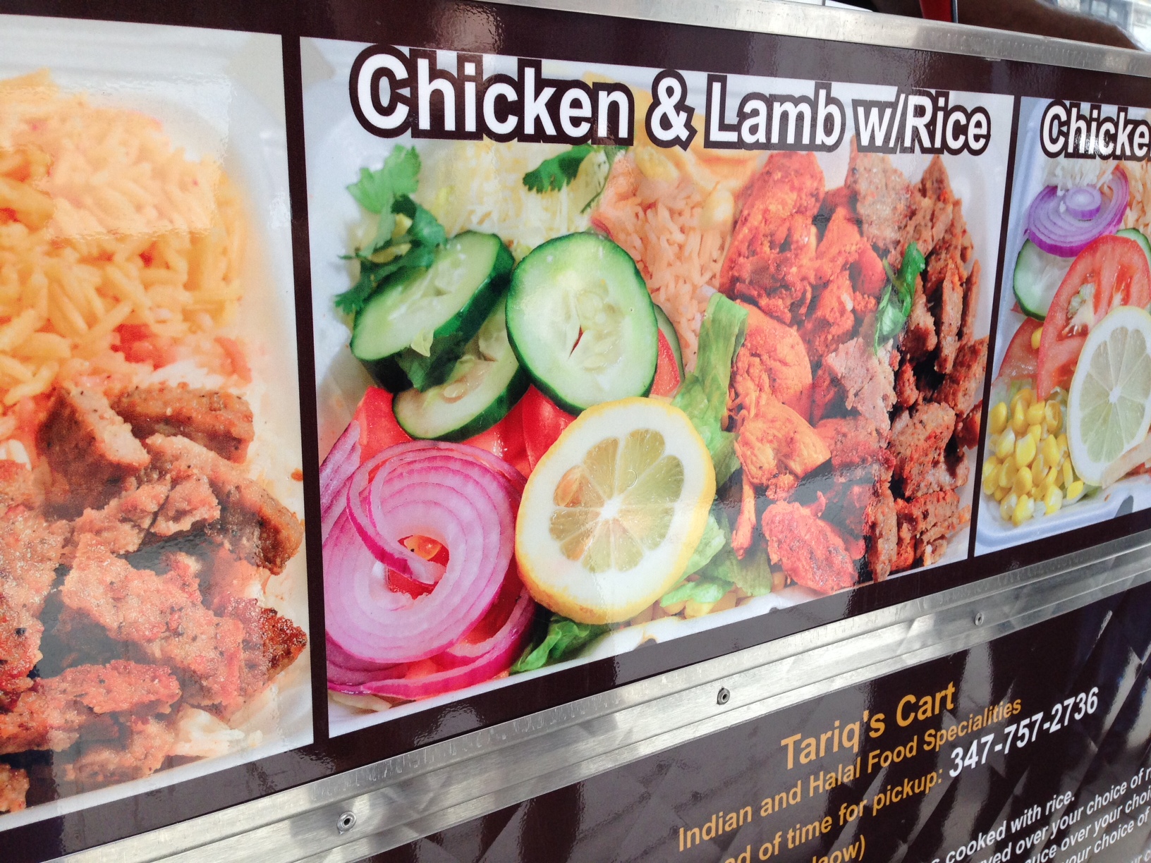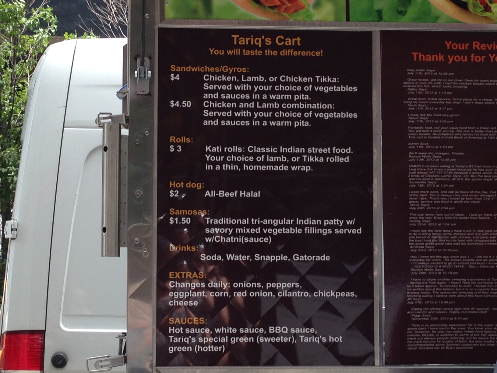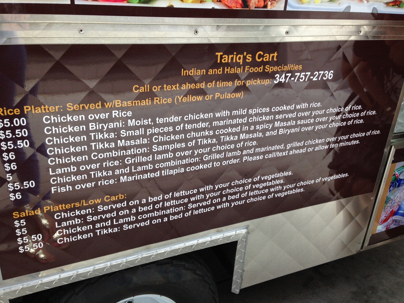 I arranged to meet a friend at the cart, which is named Tariq’s Cart with the subtitle of Halal Indian. The cart has two menus…the first with sandwiches, rolls, sides, etc.