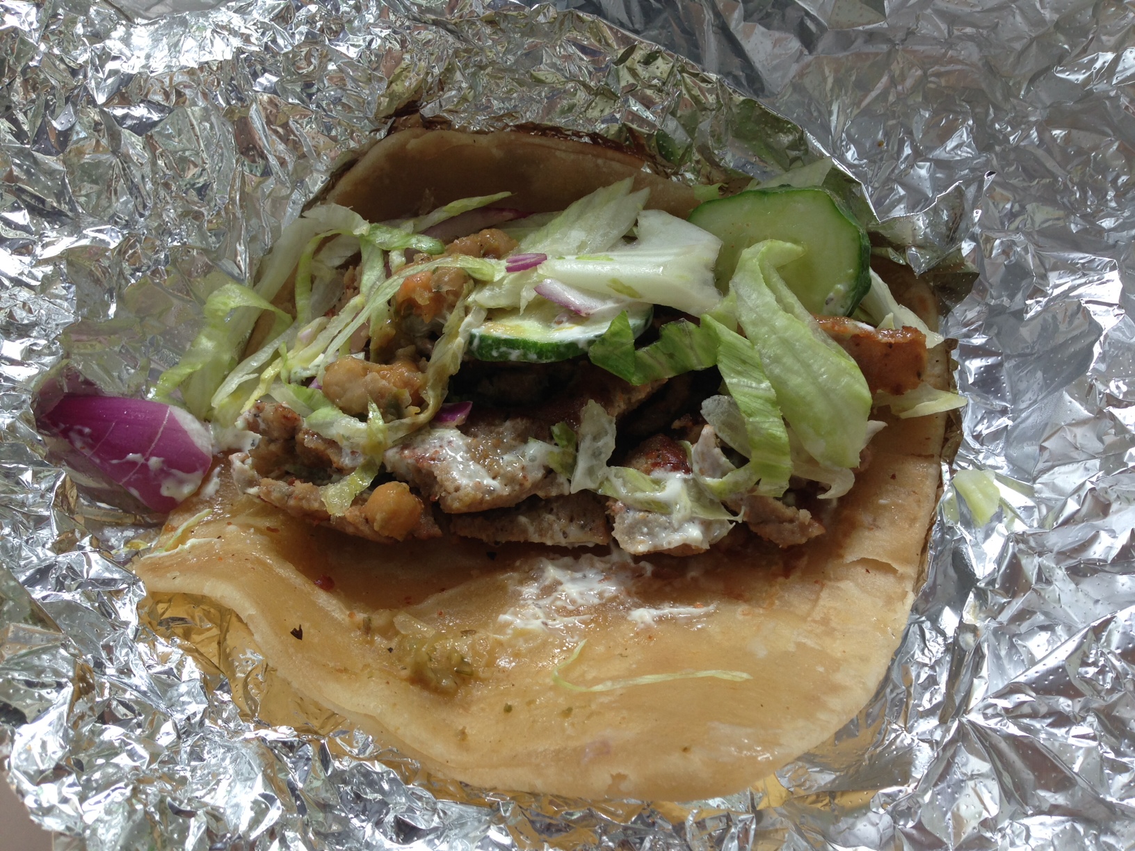 As I do when trying a new cart, I ordered the combo platter – lamb and chicken tikka on rice ($5.50). Note: they also have a chicken tikka masala platter option. Even without the masala sauce, the chicken was very flavorful and not at all dry. I ordered my platter with “everything”, which included iceberg lettuce, tomatoes, cucumbers, red cabbage, red onion, a chickpea topping, and all the sauces. I think he left off BBQ sauce, but I think I got white sauce, Tariq’s special green sauce and Tariq’s hot green sauce. The sauces were great, especially the combination of all of them. You know when street meat sauces, meats, and rice all come together where almost every bite is perfect? That happened. And even though I was warned about the spicy, it wasn’t too hot for me.