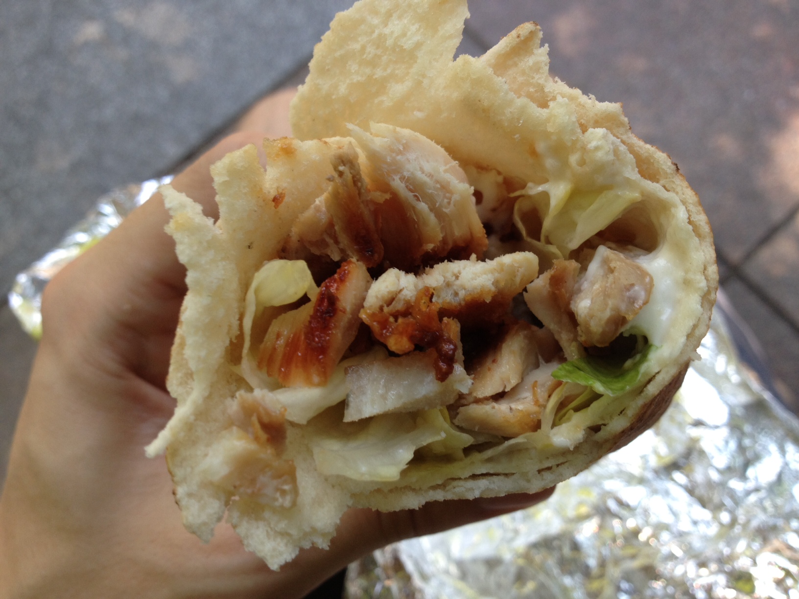 Let’s start with the bad… this was a skinny sandwich. I wasn’t exactly starving at the end of it, but I would have appreciated if it were 20% to 30% bigger. Buy yourself a can of soda on the side and you’ll likely be satisfied. As for the contents, the chicken was pretty good! Sliced right off the spit, the meat was hot, white, and tender. Some bites were slightly charred, which was a good contrast in flavor and texture. The sandwich didn’t have a whole lot else in it (lettuce, pickles and a garlic-y white sauce), but the taste was enjoyable, if not a bit plain.