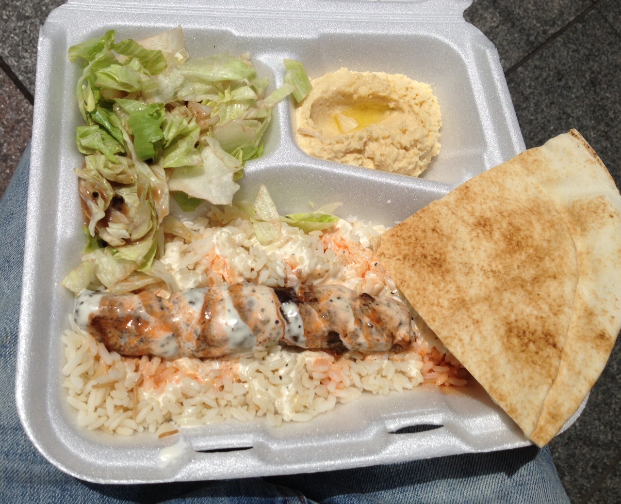The sides were also fine, but not mind blowing by any means. The salad was just made up of some lettuce with balsamic dressing. The hummus was refreshing, but they don’t give enough pita bread to wipe it all up with. I have no complaints about the rice, but the white sauce was a little too creamy for my taste and the hot sauce too mild and watery. I ate everything no problem, but given the price and the quality, there should have been more meat here.