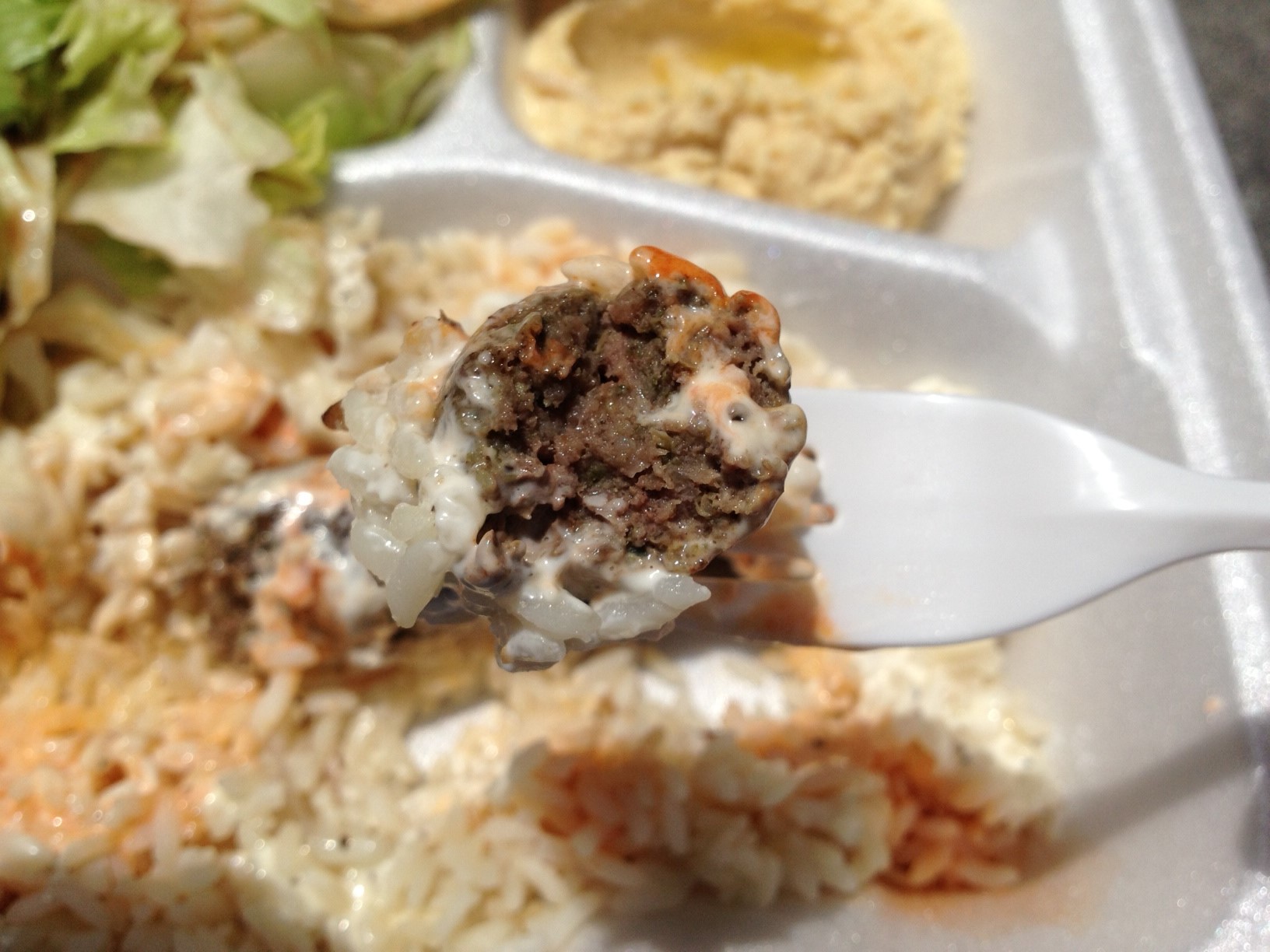 On my next visit, I wanted something pretty different, so I went with the kafta platter, a marinated beef, parsley, and onion mix over some rice ($9). I ordered the platter with white and hot sauce. Usually, $9 is more than I hope to spend on lunch, but I’ll make exceptions here and there if (a) the food is of a particularly high quality, or (b) the portions are big. So, just try to imagine my shock when I opened the container to find this: