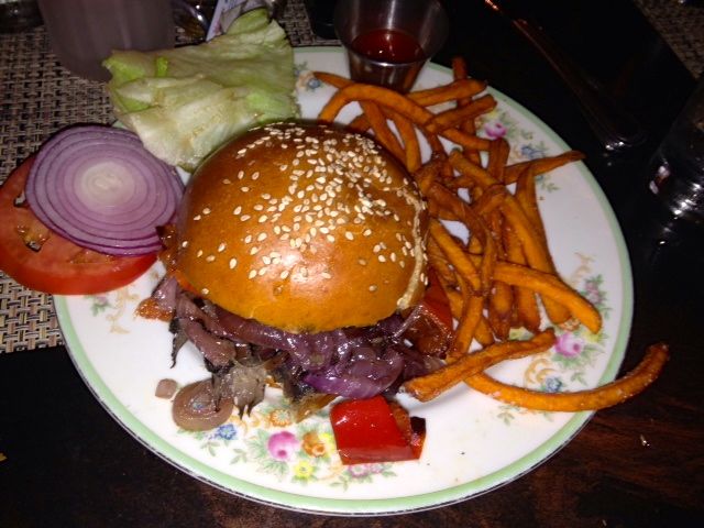 None of the entrees or appetizers on the menu were under $10, and the portobello burger I got for $15 was just OK. The sweet potato fries were good but a bit soggy as Sarah noted she had read on Yelp. I should’ve ordered them extra crispy too. The meal was filling, thankfully, so I left full for the evening.