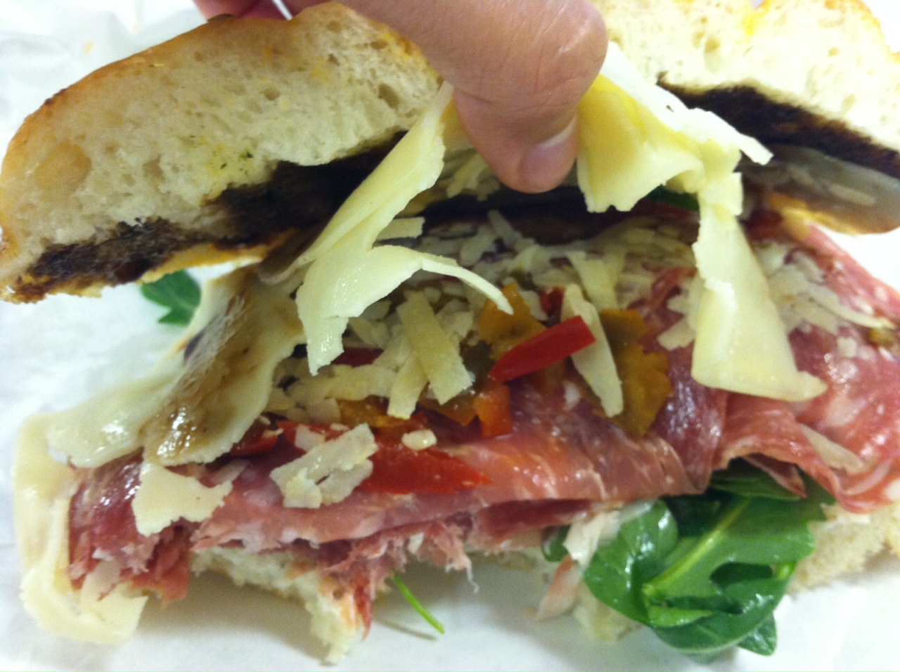 On top of the meats is a layer of sweet cherry peppers, which were not that spicy, and freshly shredded parmigiano reggiano. Then add a thin layer of provolone cheese. The top piece of foccacia was smothered with a glazed balsamic dressing, with the bottom layer smoothed over with an herbed ricotta spread. Somewhere in between all of this was fresh arugula. I was in complete heaven. The sandwich stayed together so well – no mess to be had here – and the fresh ingredients from DiPalo Selects really makes this sandwich shine.