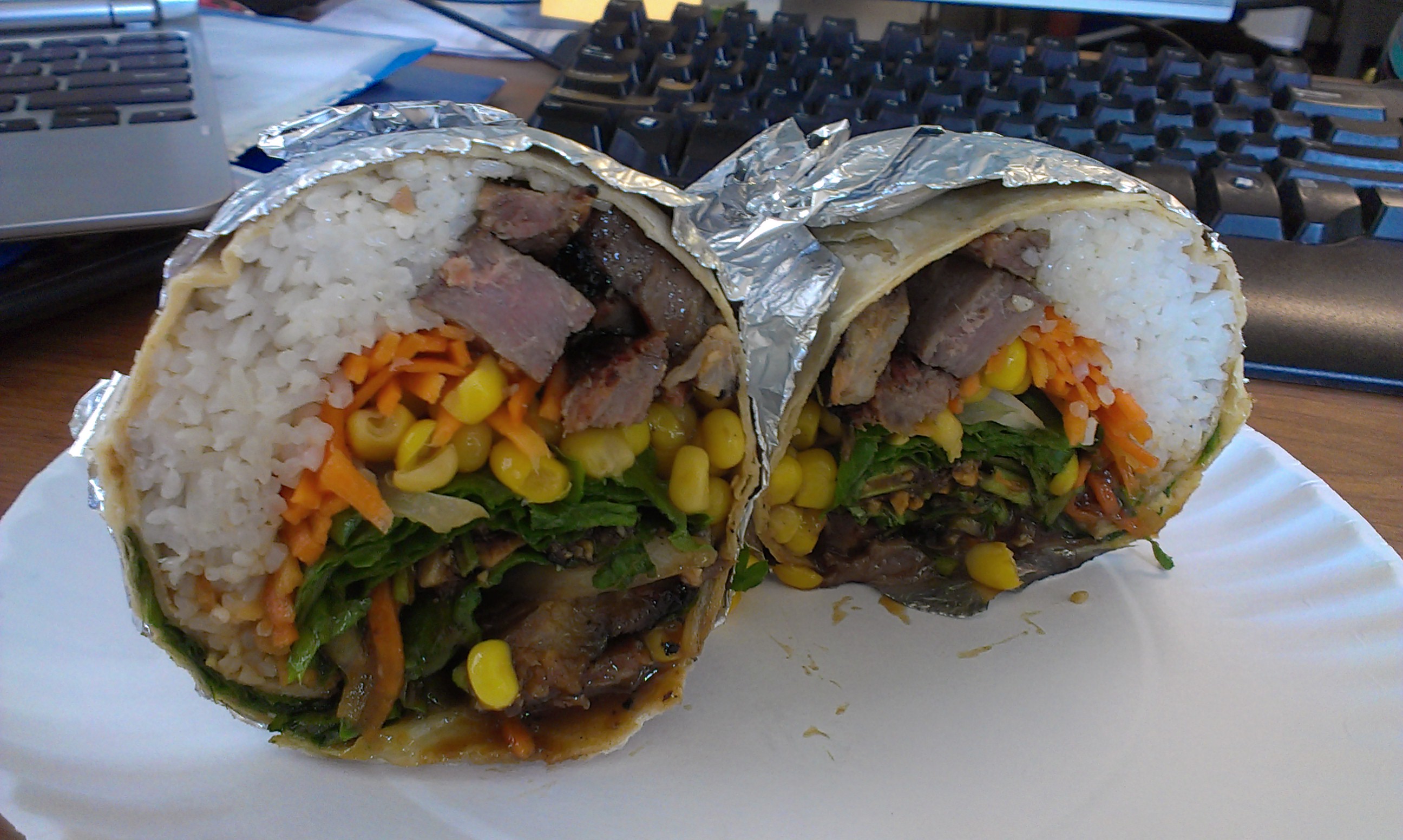The one real weakness of the burrito is that, as often happens with burritos, it each ingredients was segregated, making it difficult to get a bite with meat, veggies, and rice all together. It’s sort of like a giant spring roll with rice instead of noodles.