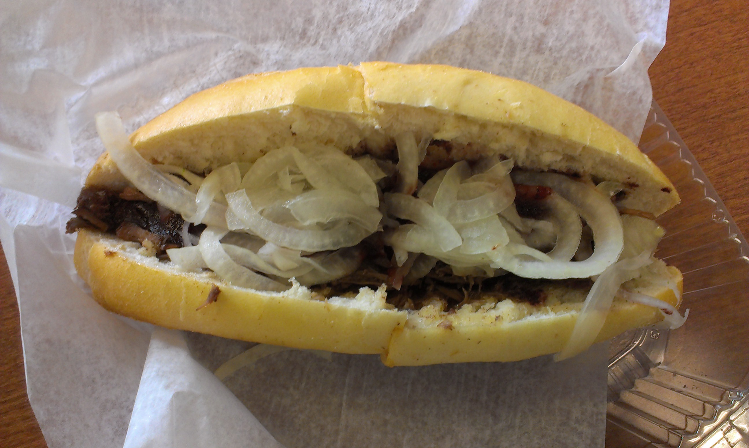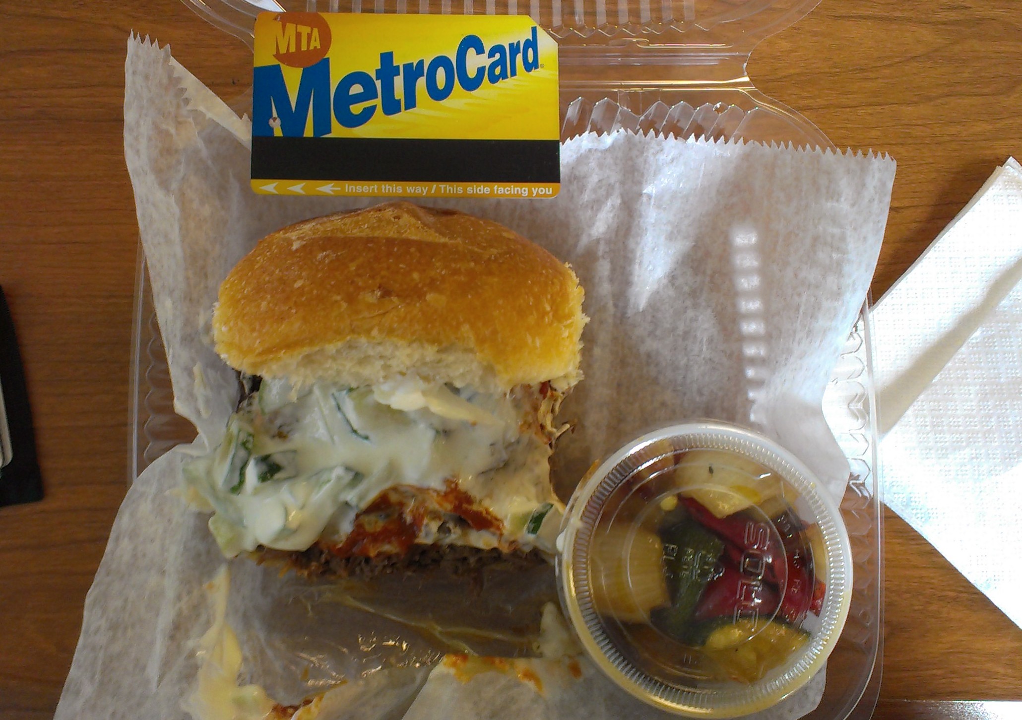 Since I only had a half lamb sandwich, I picked up a side of roasted vegetables for $2.50. I was hoping to get large pieces of warm, nicely roasted vegetables, but unfortunately what I received a small cup of cold chunks of zuchinni, eggplant, onion, and red bell pepper. The zuchinni was nice, as was the onion, but the eggplant was undercooked and the red bell pepper was neither skinned nor seeded. Plus, the was about half full of the pepper. There was some garlic mixed in as well, but I didn’t really taste it. I guess I shouldn’t have hoped for great veggies from a place specializing in braised meat.
