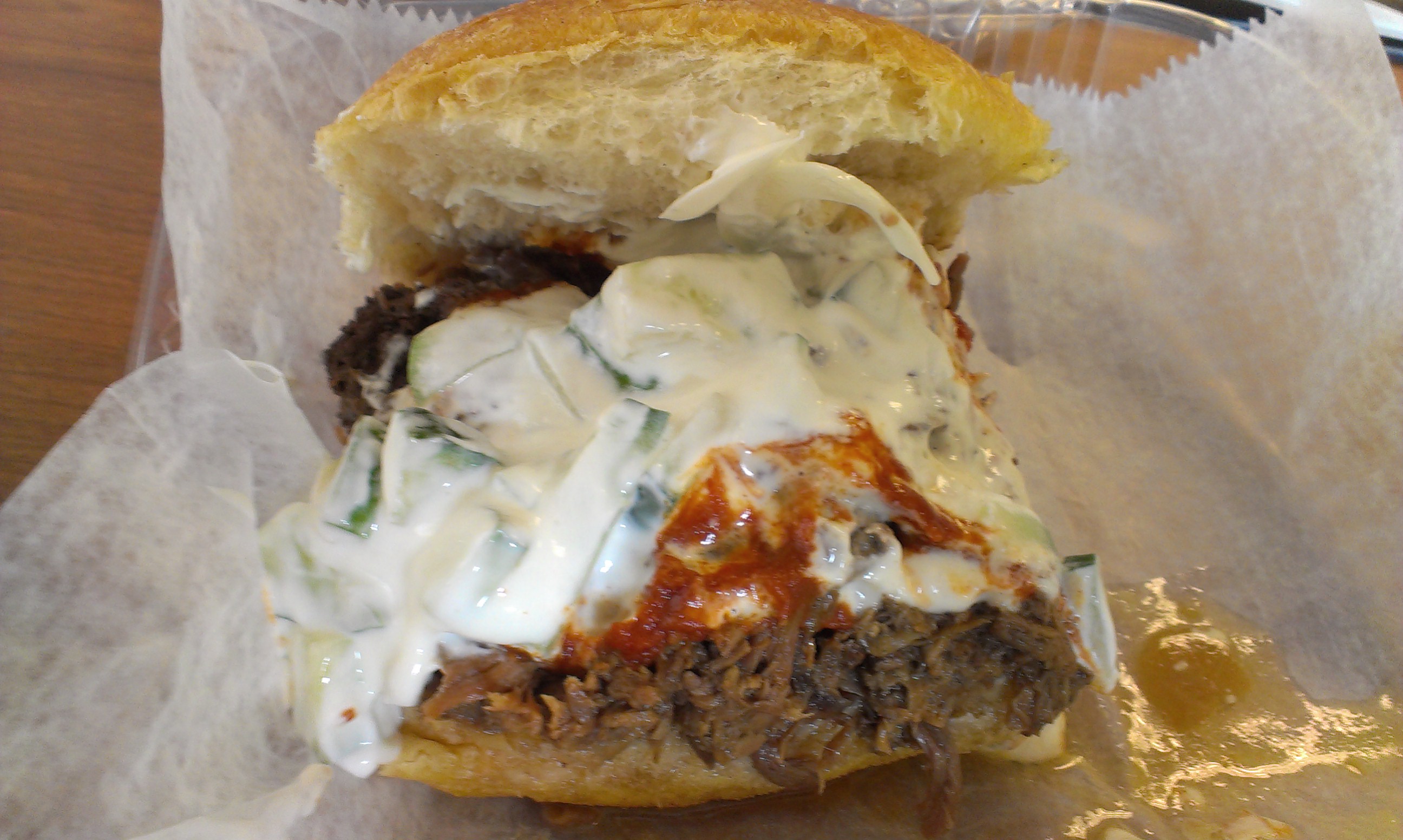 Next I tried the lamb shoulder with harissa, tahini aioli, and tzatziki sauce. This time I opted for a half sandwich ($6.25). Instead of a half hero roll, it came on a soft, almost buttery bun, good for absorbing excess fat and juices.