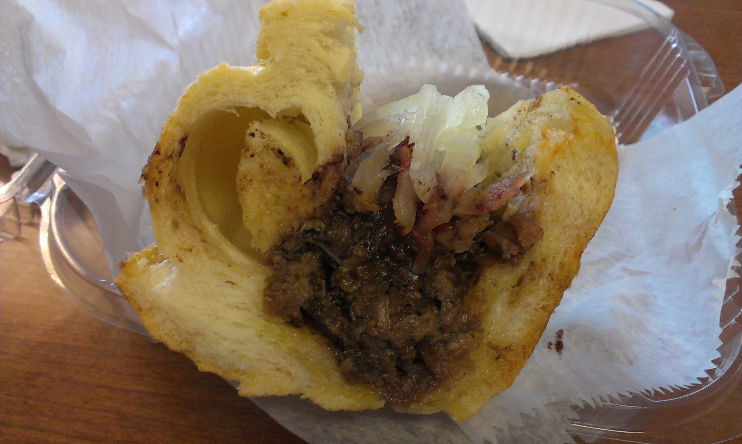 The brisket and short rib were braised till fall-apart tender and moist with fat and braising liquid. All that unctuousness was well-served by the spicy kick of sriracha. Besides its purple appearance, I was hard pressed to tell that it was blueberry srirachi, and not the plain old stuff, but it was still good. Paired along with pickled white onions, it kept the sandwich from being too rich.