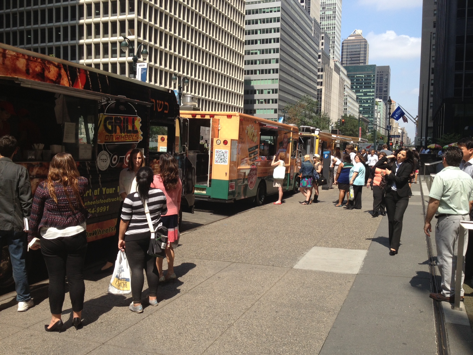 Yesterday afternoon, I counted no less than six food trucks along the east side of Park between 47th and 48th streets. I saw DiSo’s, Grill on Wheels, Chipsy King, Gorilla Cheese, La Perla Mexicana, and Bodillaz. Maybe it’s worth noting that this is also in front of a JP Morgan building… Is the big bank doing something to lure these trucks nearby? In any case, I certainly don’t mind. It’s quite nice to stroll down 47th street and then up Park and just survey all of the food options. Between the two blocks, you can expect 10-15 different trucks to choose from on any given afternoon. It’s kind of like an outdoor, urban food court.