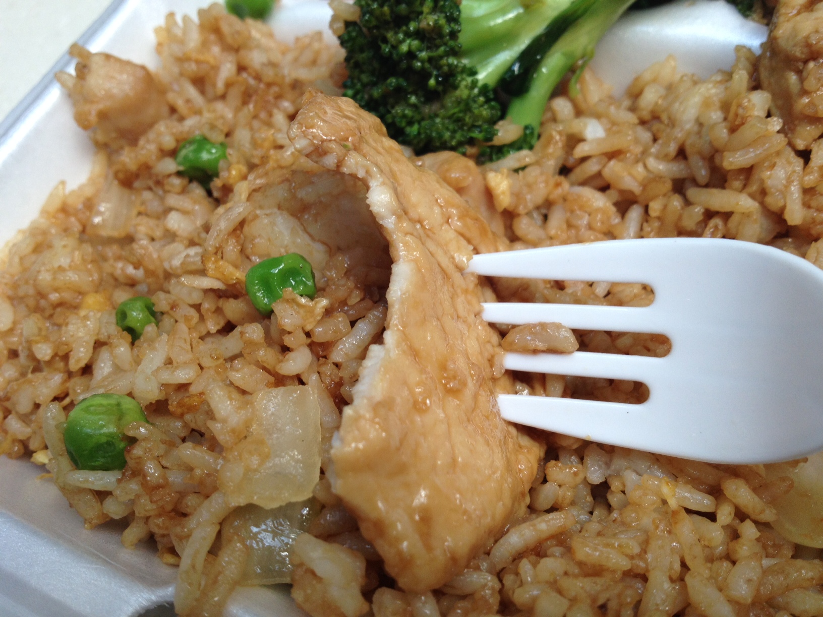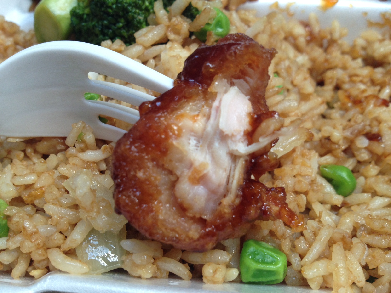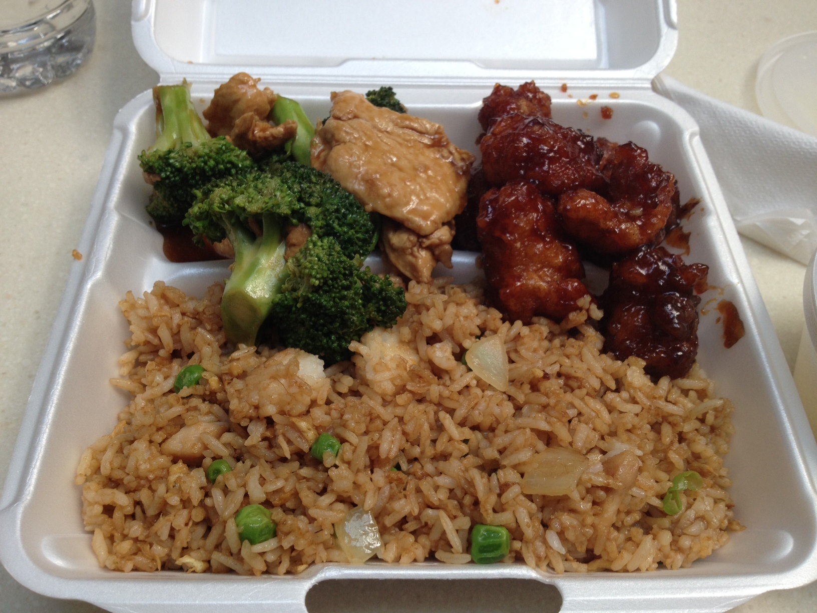 The fried rice was pretty good! It had plenty of bites of pork, which was a nice touch. The General Tso’s had very sweet, barbecue-like sauce, so it wasn’t the least bit spicy. When eating the stuff, I tasted a lot more of the fried coating than I did actual chicken meat, which could be good or bad depending on your outlook. I usually prefer my Chinese food broccoli to be soft and doused in some sort of brown sauce, but this broccoli had more of a fresh, raw taste. The chicken that came with it was super thin, but still flavorful.