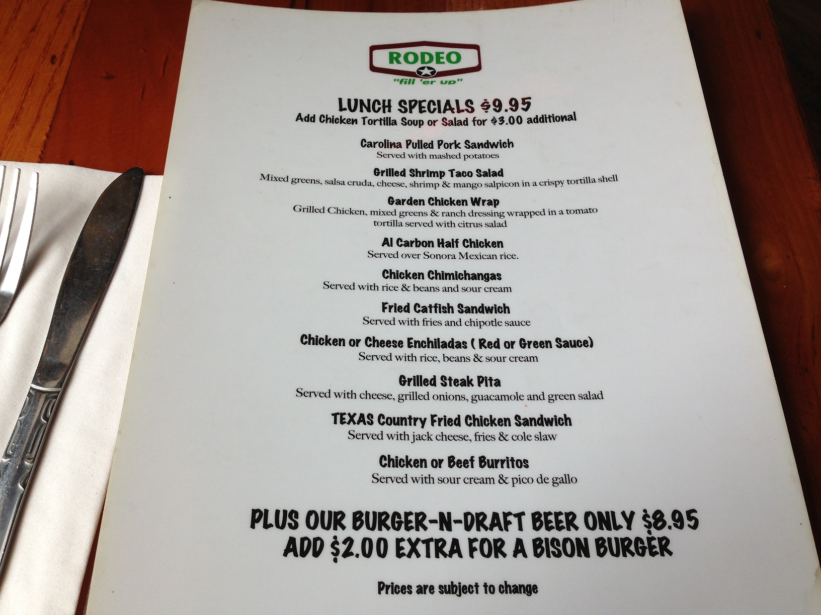Basically, Rodeo has a very laid back atmosphere during lunch. Elvis playing from the speakers (sorry, no live music during the day.) My recommendation is to go with co-workers whose company you actually enjoy – I think you are going to want to sit and chat.