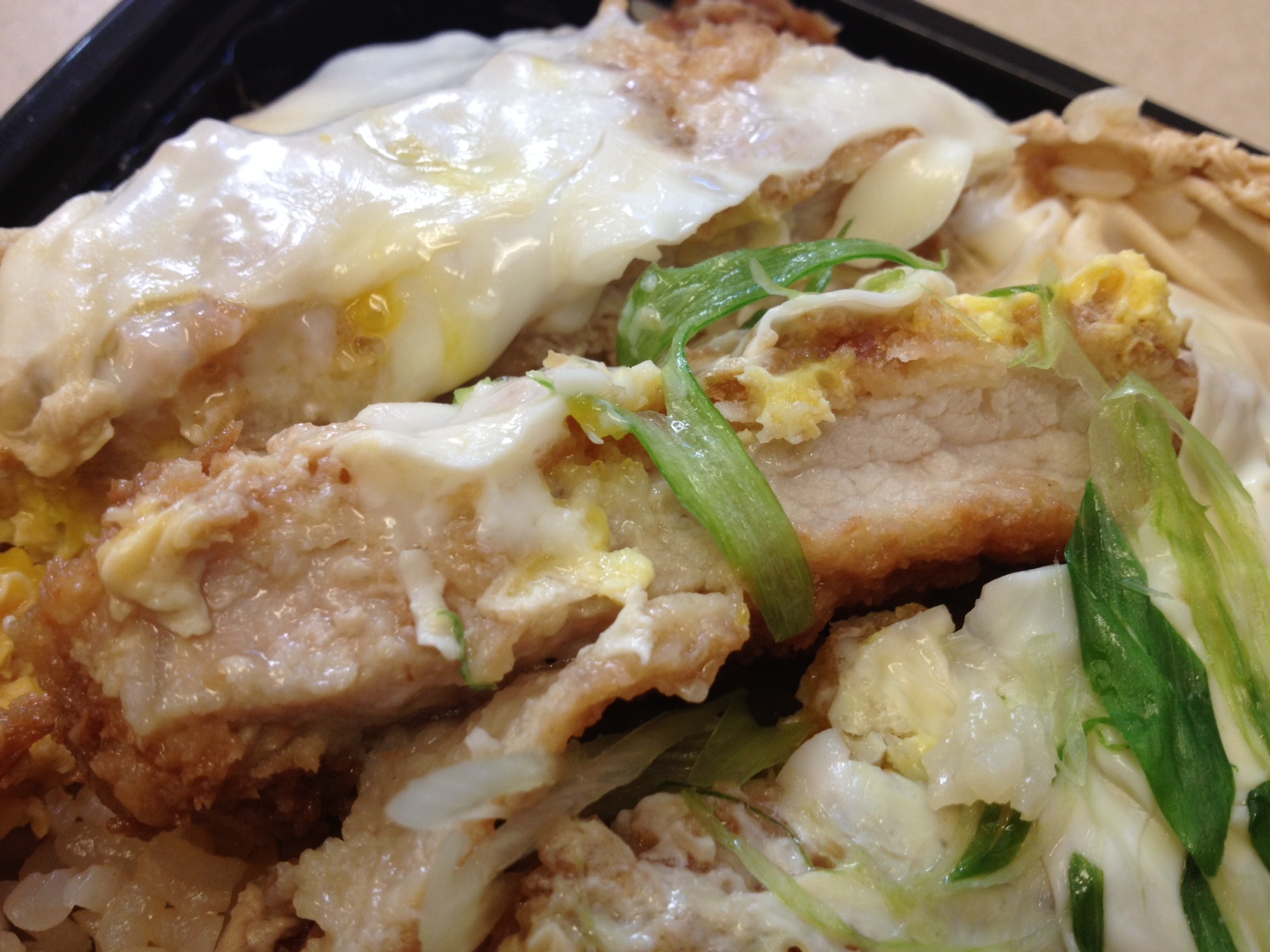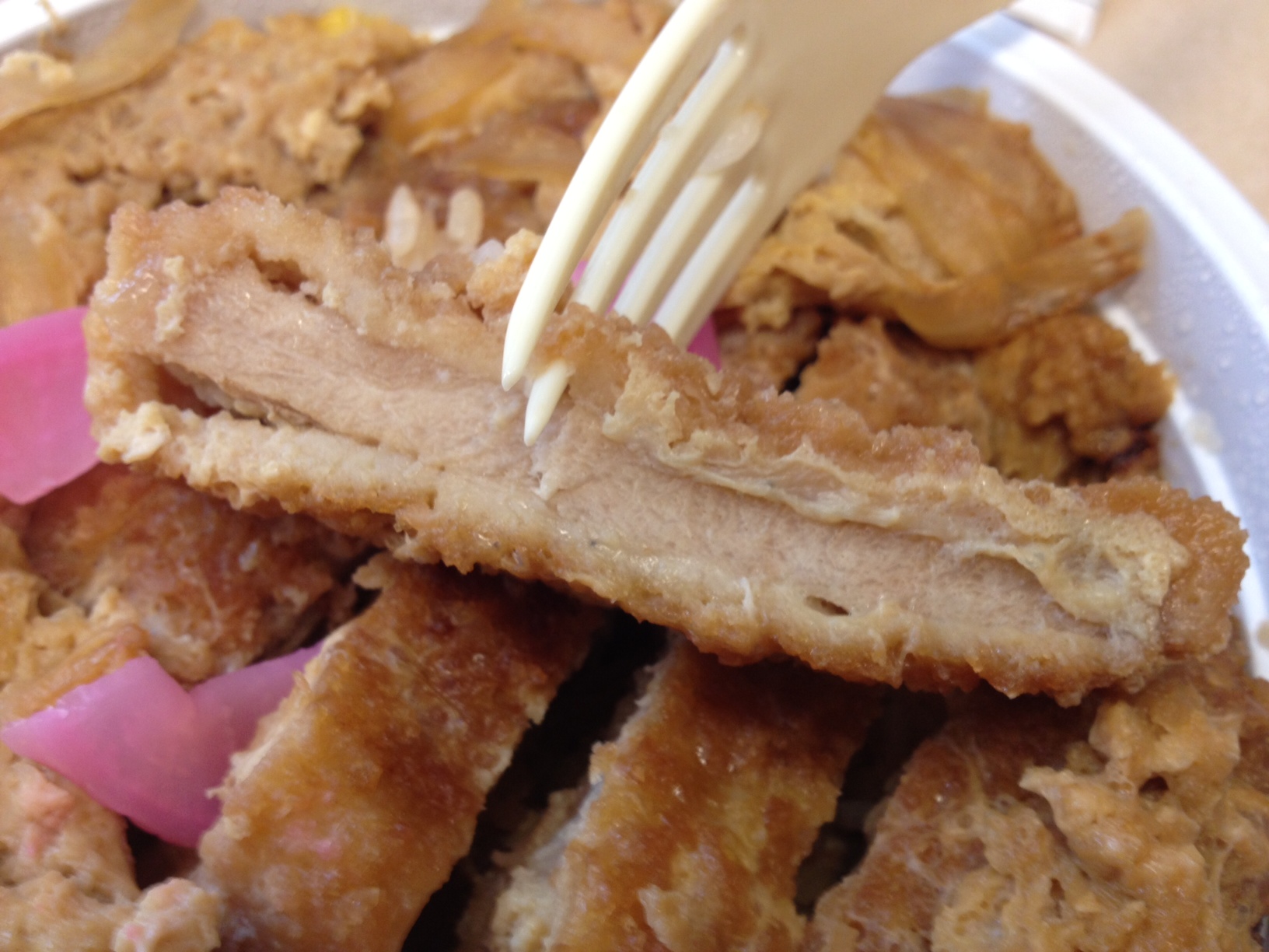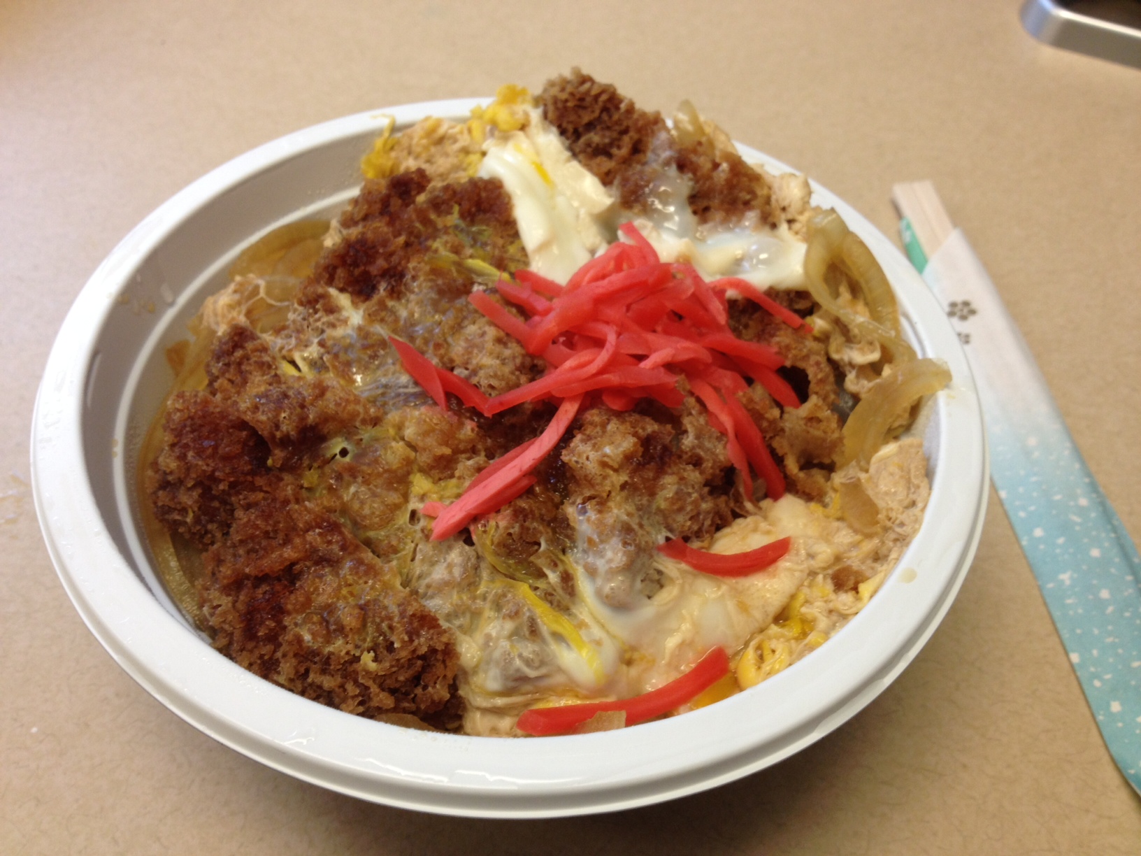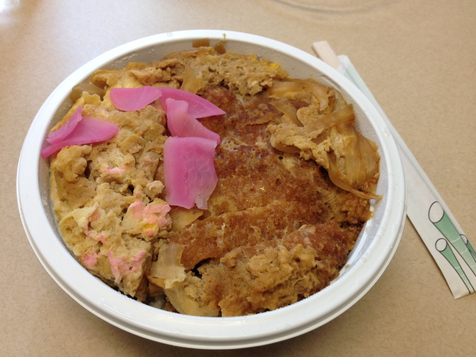 I didn’t see anything specifically labeled “katsudon,” but there is a “pork cutlet with egg bowl,” which is essentially the same thing. At $6.50 before tax, this is by far the cheapest katsudon option I encountered on my journey. Unfortunately, those few dollars saved really seem to make a difference…