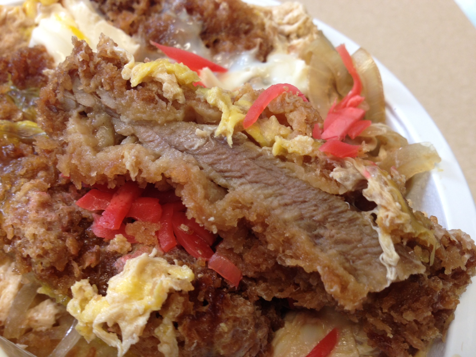 Btw, the red stuff is called beni shoga (literal translation “red/crimson ginger”). Can’t recall what makes it red, whether it’s some dye or something else, but it’s traditional to serve it with not just katsudon but also yakisoba, for instance. I suspect that, much like its use when eating sushi, it’s for cleansing the palate between different tastes.
