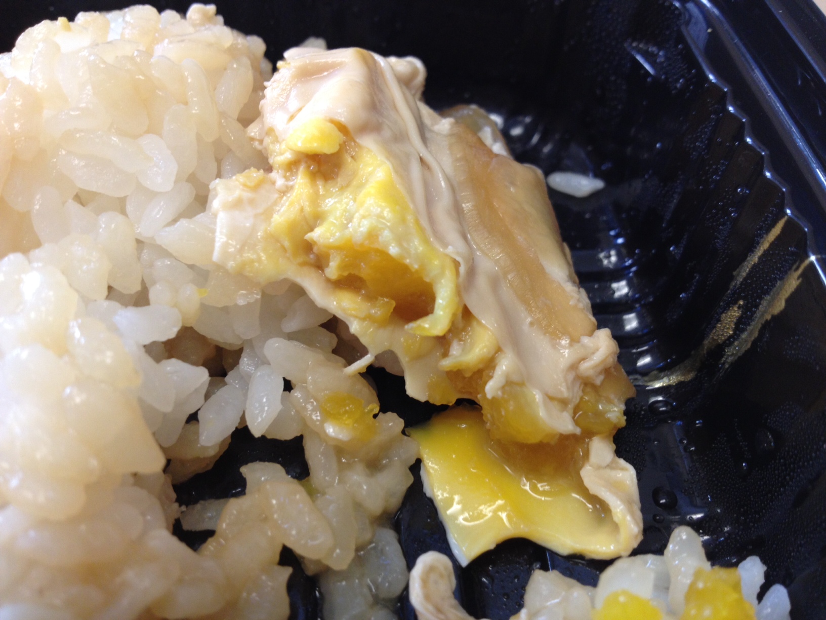 The best thing about this bowl is the size. Any dish under $8 that will totally fill me up is a good deal, but there’s really no comparing the quality of this to ISE Men Kui Tei or the other katsudon I tried. After two minutes in the microwave, the meat was soggy and chewy. The fried stuff was mostly tasteless and tended to slide off the rest of the meat. It wasn’t clear to me if this was due to the time spent in the microwave or if the pork was just cheap stuff to begin with.