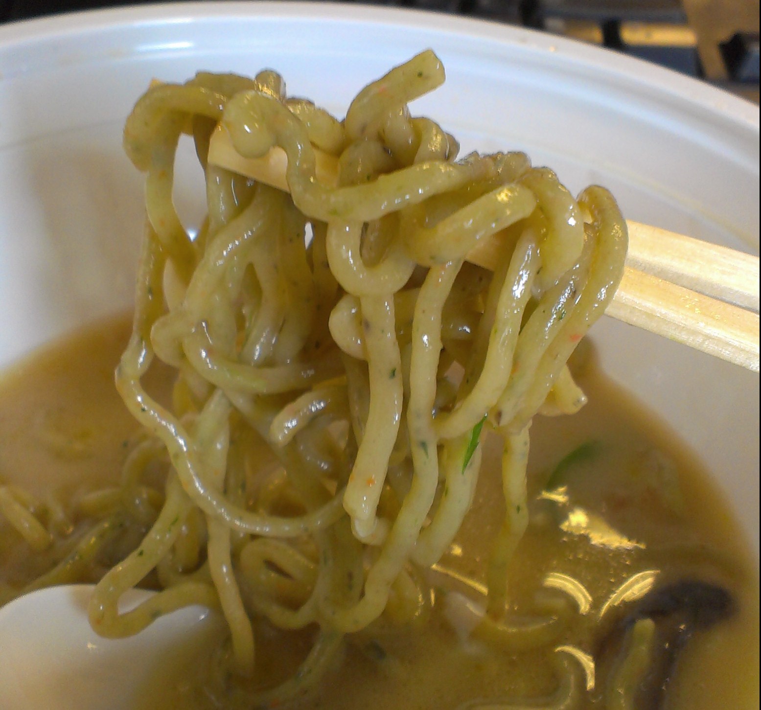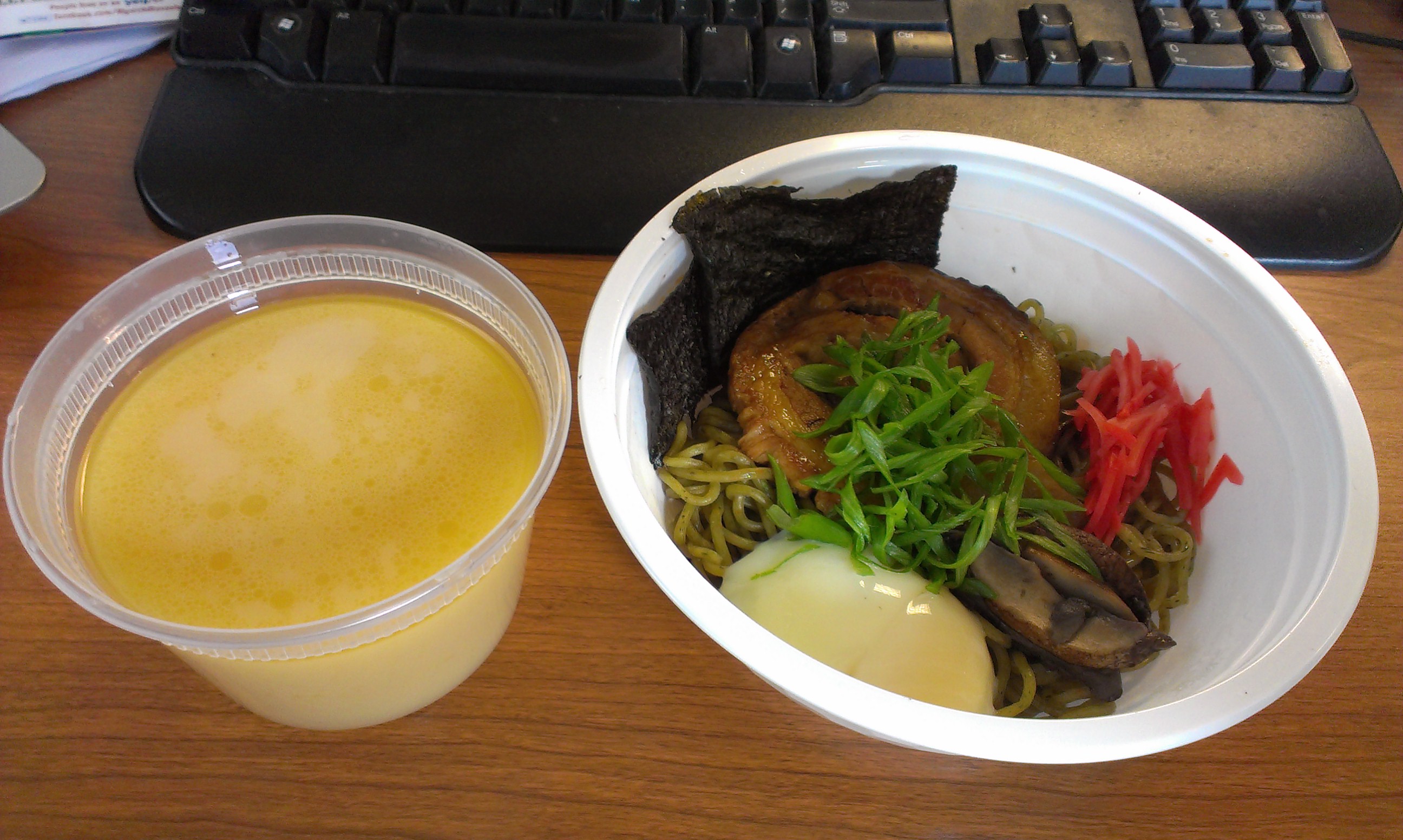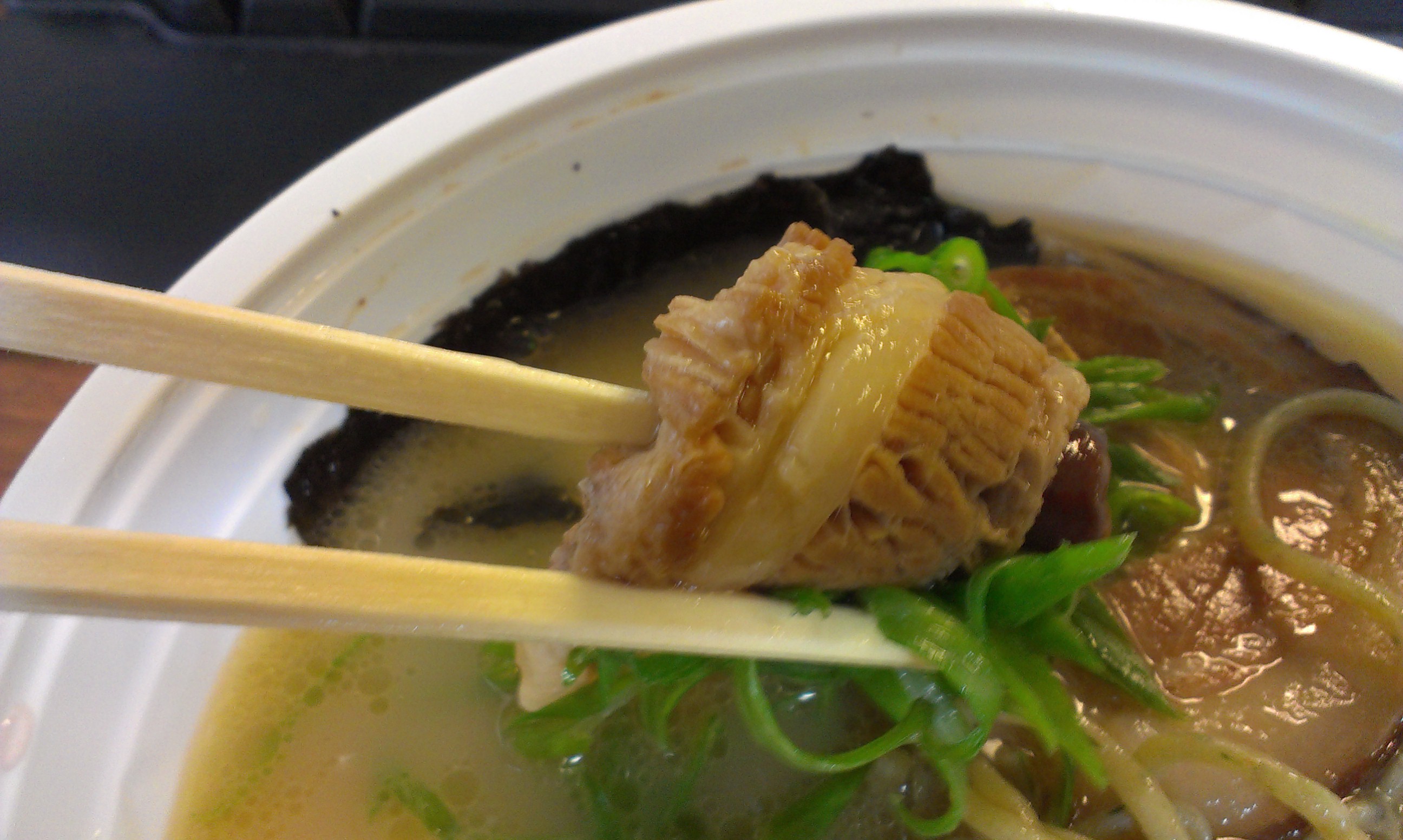 I chose the traditional tonkatsu ramen with pork. I was getting take-out, so I was worried those freshly made noodles would be overcooked by the time I got to eat, but thankfully, Nikai does the right thing and packs the broth separately. Just combine, stir, and your ramen is ready.