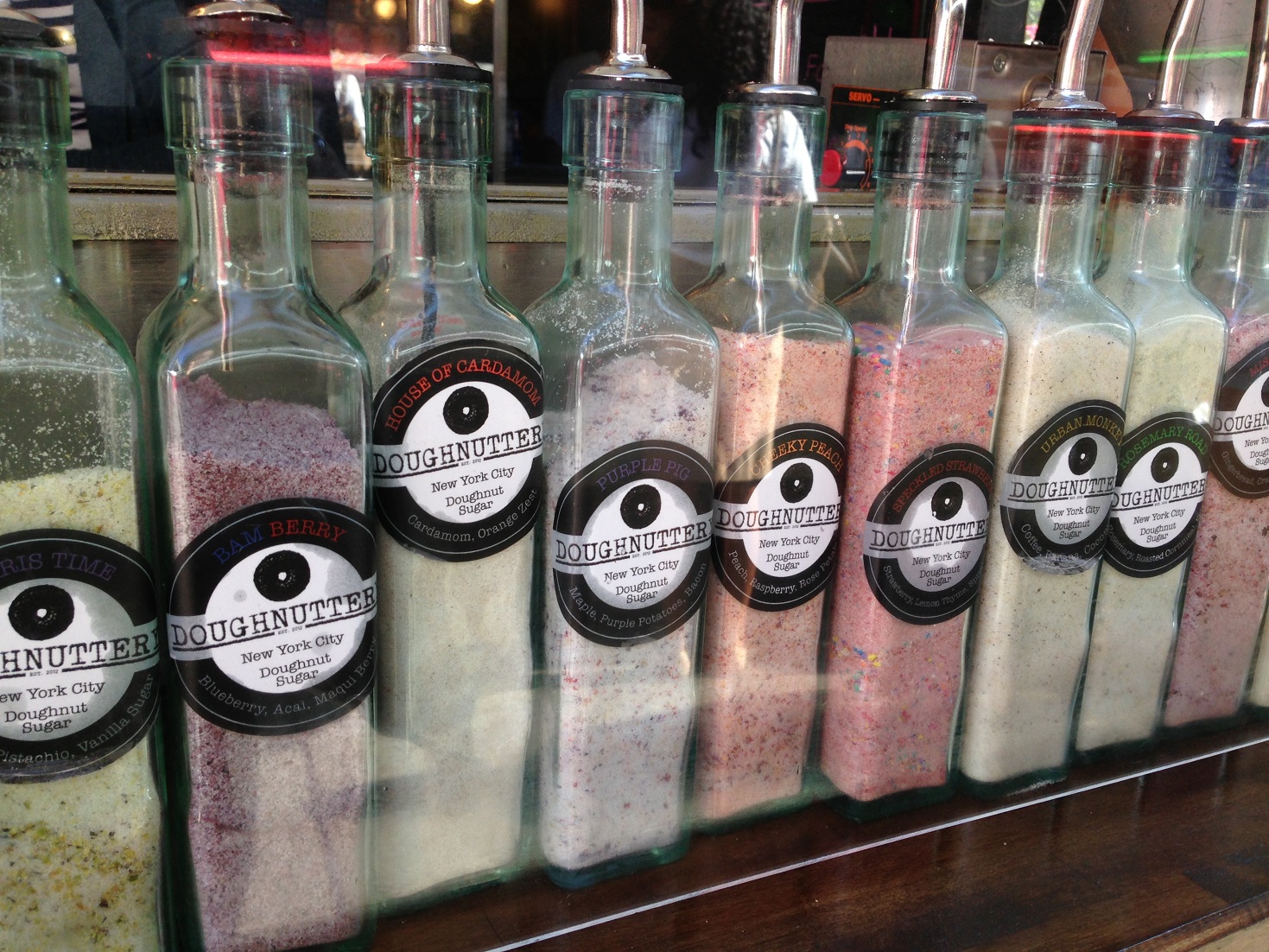 I also wanted to give some attention to one of the many dessert options at Mad. Sq. Eats. I, for one, end up needing something sweet every afternoon at about 3pm or 4pm (sometimes both). So, I bought six mini donuts from Doughnuttery for $6. Since they make you buy a minimum of six, they at least let you choose two different flavors. The flavor options are fairly overwhelming and probably unnecessarily complicated. They have a list of all the flavors, but the bottles of sugars are just so much prettier than a list. They have one topping that isn’t a sugar – a vanilla glaze. I didn’t notice it until after I had ordered, but it would have been a good option.