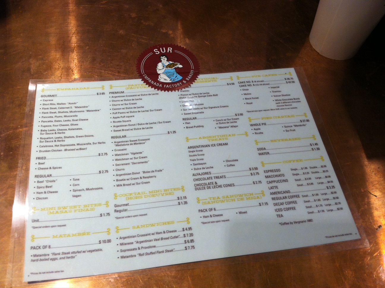 The wait is finally over! After anticipating its opening since last February, Sur Empanadas fried up their first set of Argentinian empanadas in Midtown East this past Tuesday. The empanada factory and bakery servers gourmet, fried, and regular empanadas ($2.75-$3.65 each) in addition to a selection of sandwiches ($5-8), pastries, cakes, desserts, and ice cream. We have a peek at the full menu (and an early review from Lunch’er “Hightemp”) after the jump…