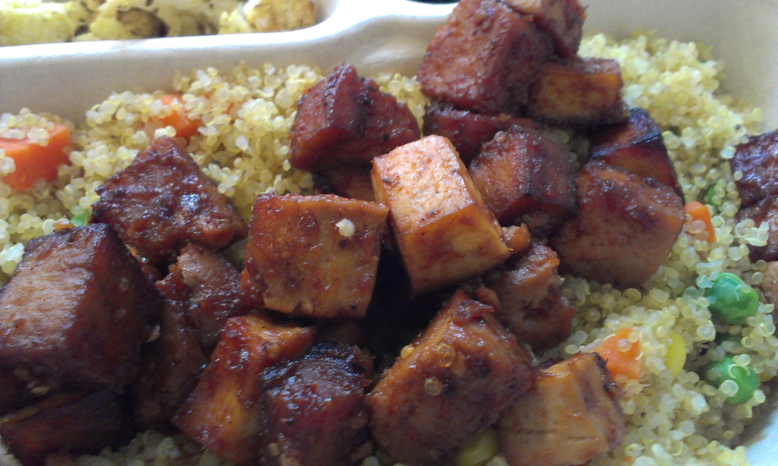 The weakest part of the meal, but still pretty good, was the quinoa. It was mixed with peas, corn, and chopped carrots. It provided a good backdrop for the tofu, but compared with the sides, wasn’t too flavorful.