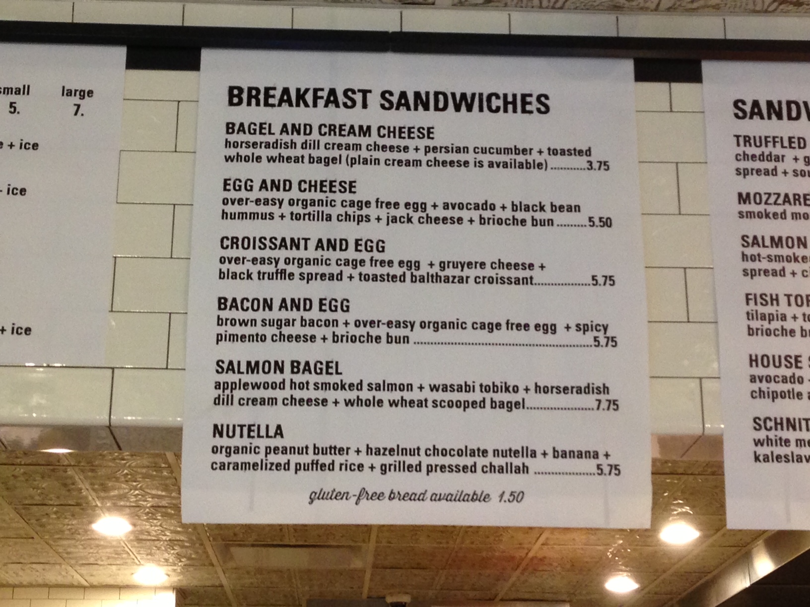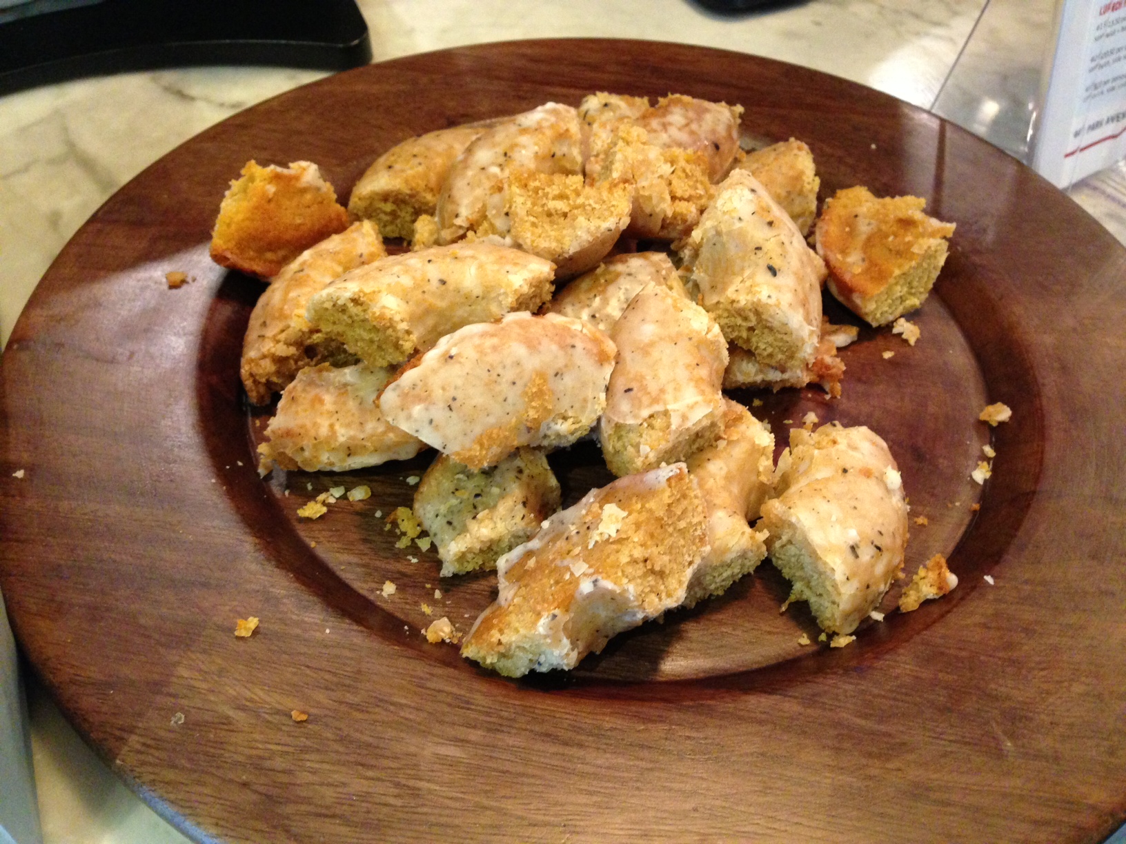 First, he ordered the salmon bagel ($7.75), which came with applewood hot smoked salmon, wasabi tobiko, horseradish dill cream cheese and a whole wheat scooped-out bagel. I won’t say it this sandwich was as good as the Super Heebster from Russ and Daughters, because it isn’t. But it still very good. I loved the idea that they scooped out the bagel, even if it wasn’t well executed. I think the scooped out bagel gets a bad wrap rap (see grammar lesson below). Think about it: it can make a bagel sandwich sooo much more enjoyable without the filings sliding out of every side.