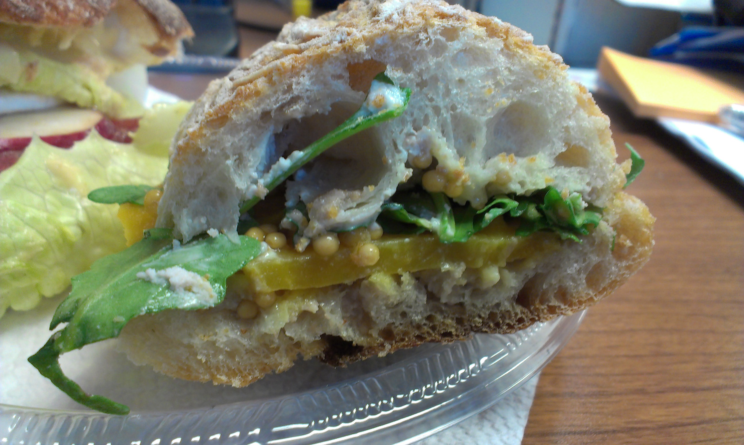 The beet salad sandwich had sliced golden beets, goat cheese, arugula, walnut crema, and pickled mustard seeds. Beets and goat cheese are a classic combination, of course, but it was the walnut crema and mustard seeds that sold me. The mustard seeds were good, adding a nice bite to balance with the creaminess of the goat cheese, but I couldn’t taste any walnut flavor. Despite that, the flavors of the sandwich worked well. It’d have been a great sandwich except that the bread, a ciabatta roll, was on the hard side (well beyond crusty).