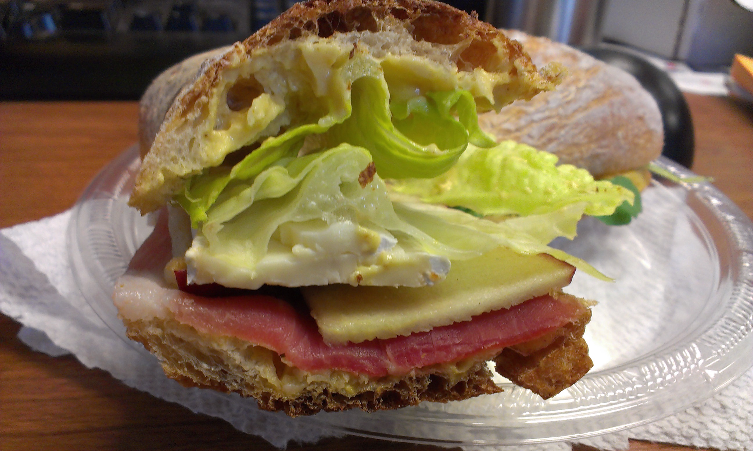 The PBA was a bit better, but at $10, was also on the small side and needed more filling. The prosciutto, thinly sliced apple, and brie complemented each other nicely. Romaine lettuce adds a nice crunch, and dijon mustard added a nice, vinegary bite. The bread, a piece of baguette, was just as crusty as the ciabatta, but that seemed to work better with this sandwich. I just wish there was another slice of prosciutto or two, since the sandwich was quite spare. I had a half of each sandwich, and that was not enough to tide me over until dinner.