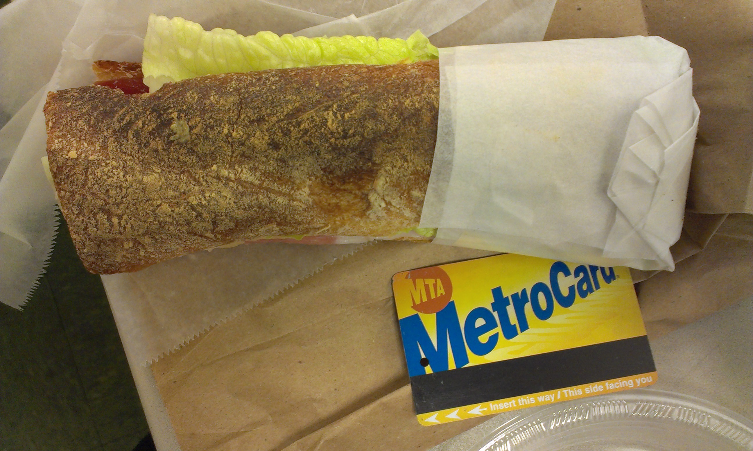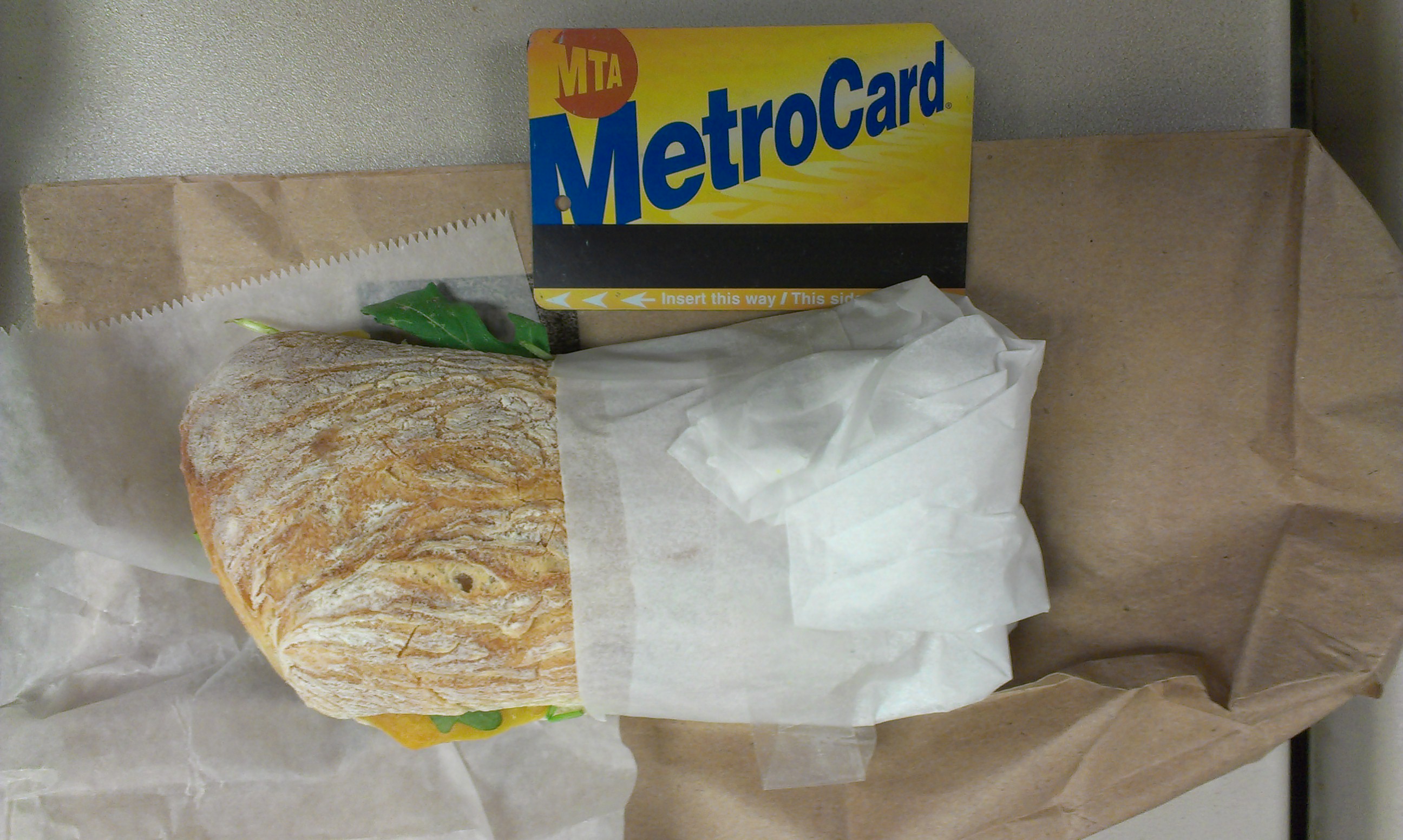 Ground Central Coffee Company, a small coffee shop that opened on 52nd St. (btw Lex+3rd) last month, boasts a lunch menu with sandwiches that sound really good. And with price tags just below and sometimes above the ML limit, you’d expect them to be really good. But before we get to that, let me just say that Ground Central is a really cool coffee shop. It’s got a nice drink menu of coffees and teas and a nicely decorated interior with plenty of seating. It’s definitely somewhere I’d go to relax over a hot drink. They’ve also got a bunch of tasty-looking baked goods like madeleines, chocolate chip cookies, and financiers. And when you buy a sandwich or salad, you get a free drink.