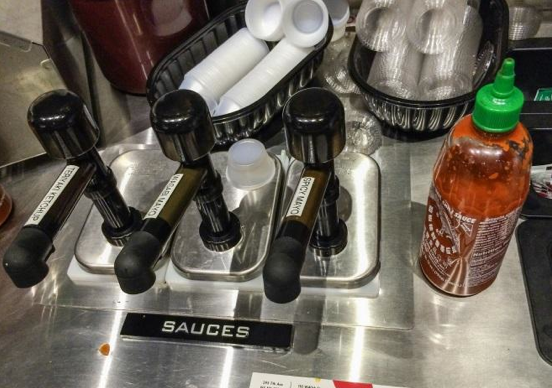 Kobeyaki (on 40th & 6th) has quickly become one of my all time favorite Midtown lunch establishments. While I often end up spending a little more than the ML limit ($13), I am never left disappointed. I like to mix it up between one of their burgers or buns, but I always order a side of the sweet potato tempura fries. What really makes Kobeyaki stand out, however, is their selection of sauces. They offer teriyaki ketchup, wasabi mayo, spicy mayo and plenty of sriracha. If you thought it couldn’t get any better, it can – not only do they offer all of these sauces, but they put them out in dispensers for sauce-loving lunchers like myself to overindulge in. As you can see, they offer plenty of containers for patrons to fill up with the sauce(s) of their choice. A few times, I have found a particular sauce empty, and upon notifying an employee, the sauce is refilled within minutes – impressive.