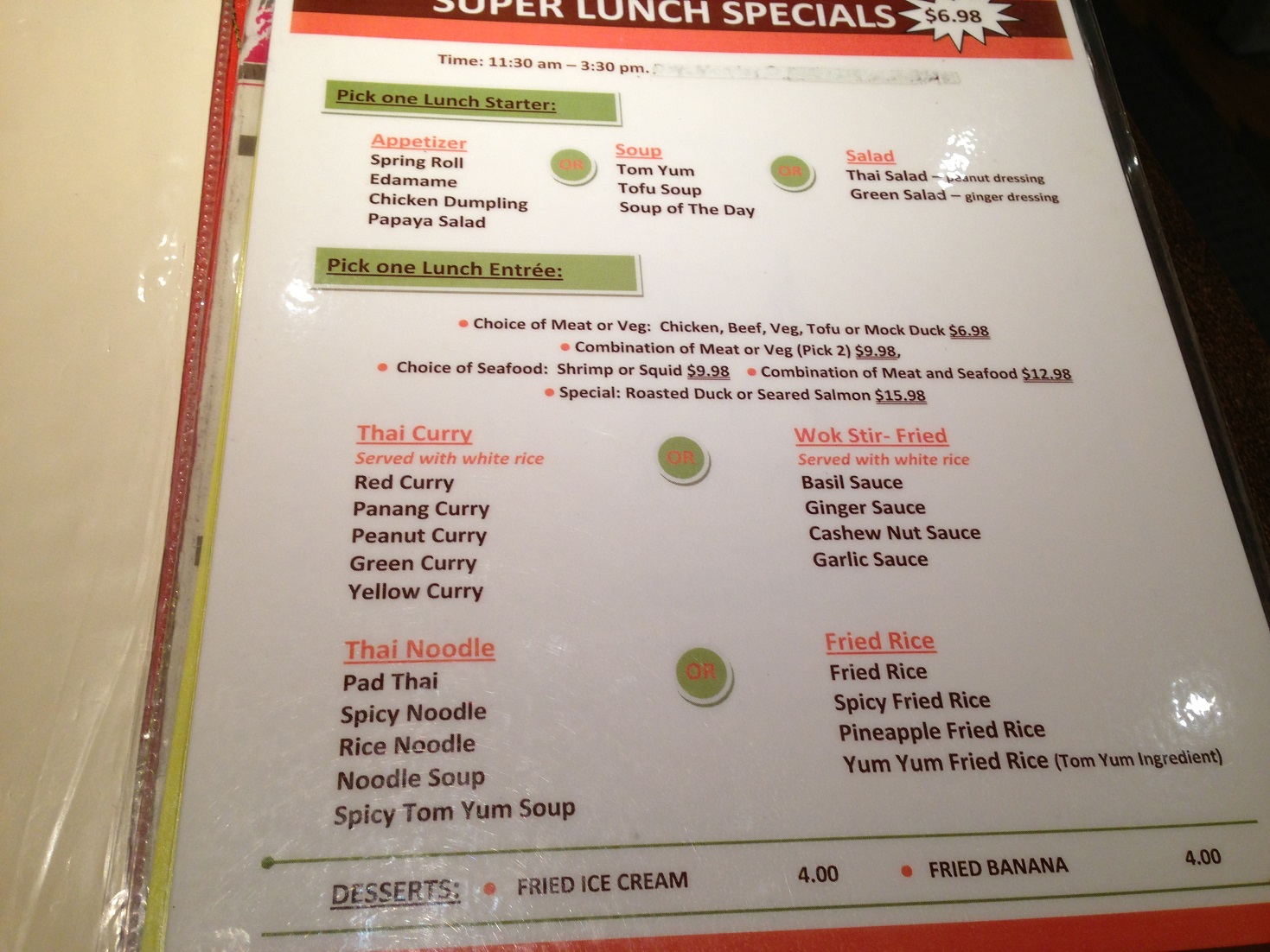 Glad you checked it out and thought it was good! Although the pad thai isn’t spicy, many of their other dishes have a lot of heat, like the spicy/drunken noodles, the papaya salad, and most of their curries. You can always ask for some heat–their spiciness is pretty warm. The wings are definitely better fresh/hot. And they do have a lot of options for the $6.98 lunch combos, as noted on the menu above. Spicy noodles are a high point if you like the heat. Oh yeah, their mock duck option comes in pretty large chunks; interesting stuff…