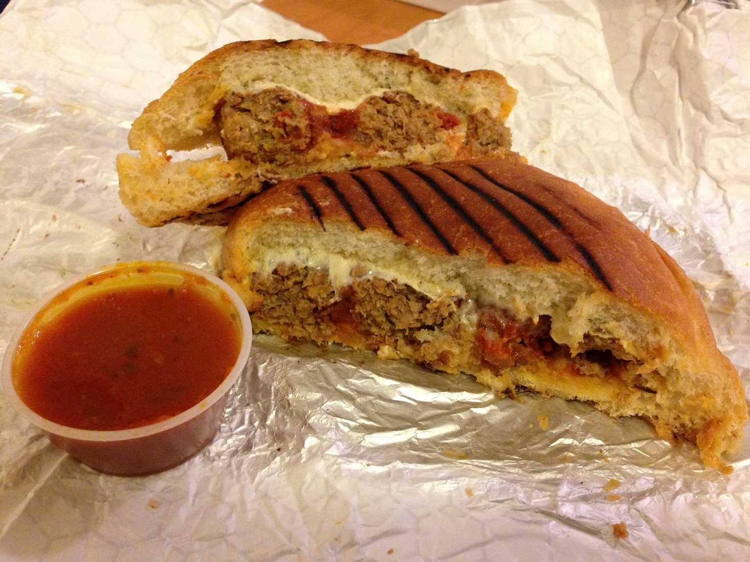 After such a successful wrap, I went back to try something more. But not fear, I skipped over the salads, and opted for a “meatball” sub sandwich. Before you start complaining about fake meatballs and daiya cheese, I will tell you that I shared the sandwich with a friend who is a confirmed meat eater and loves Italian sandwiches (meatball, chicken parm, etc). Of course, I didn’t tell him it wasn’t real meat in the meatballs until after he said how good it was and asked me where I got it. When I told him it was vegan, he said, “So what you mean is that the cows that the meatballs are made from were vegans?” Amazing. The toasted rosemary bread (not vegan?) made the sandwich even better.