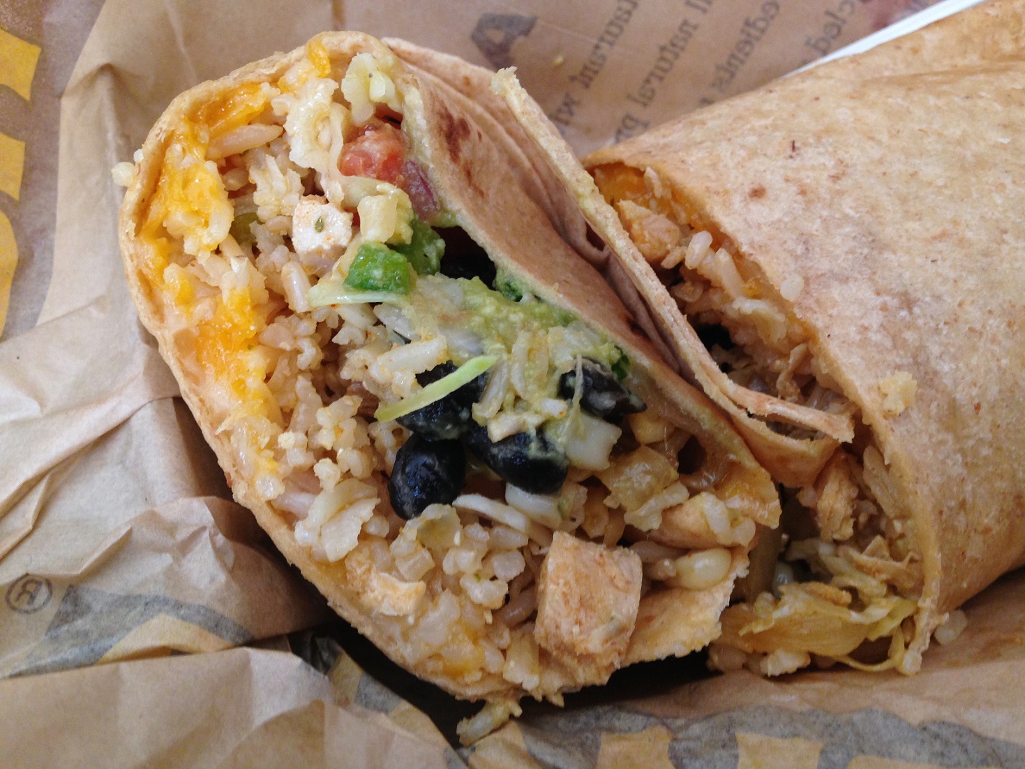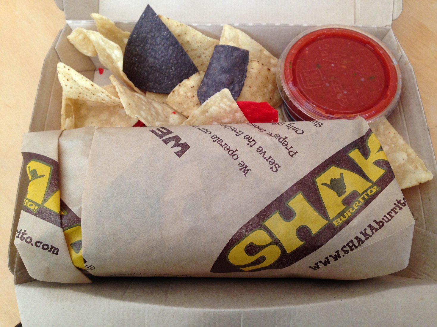 The Big Kahuna burrito ($9.95) seemed like a safe ML bet with chicken, beef, two types of cheese, cabbage, guacamole, beans, brown rice, onions and corn salsa in a whole wheat wrap. The burrito came with a fair side portion of tortilla chips and salsa, which I downed (not totally surprising given I have been known to have chips and salsa for dinner).