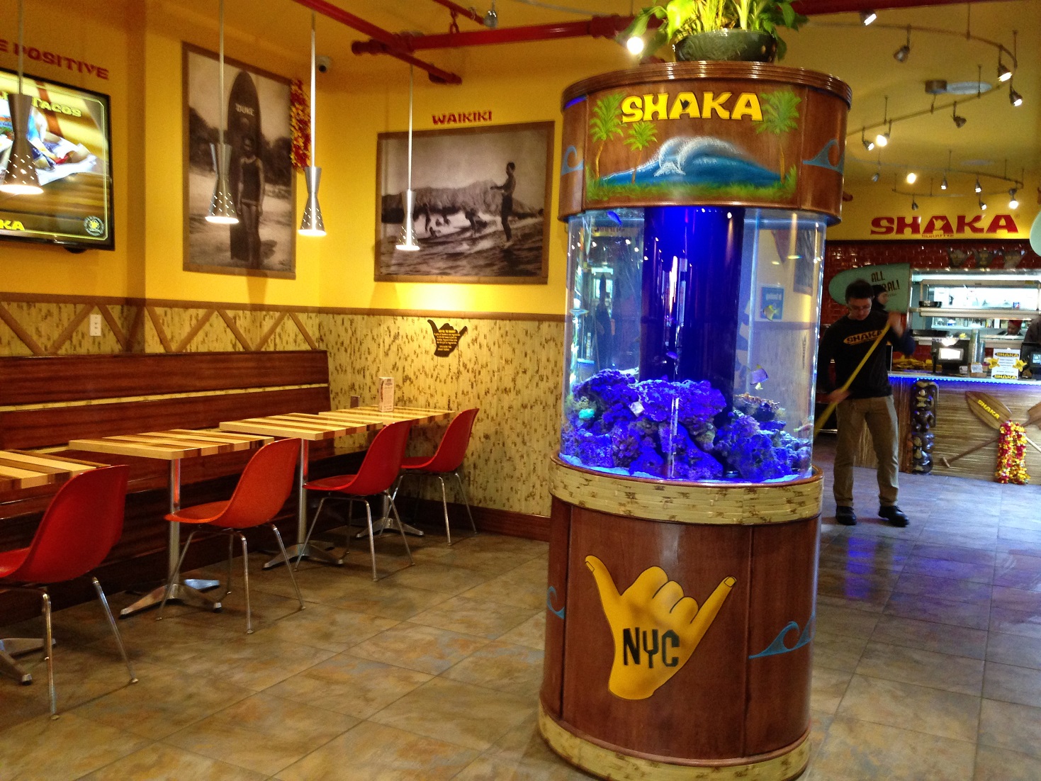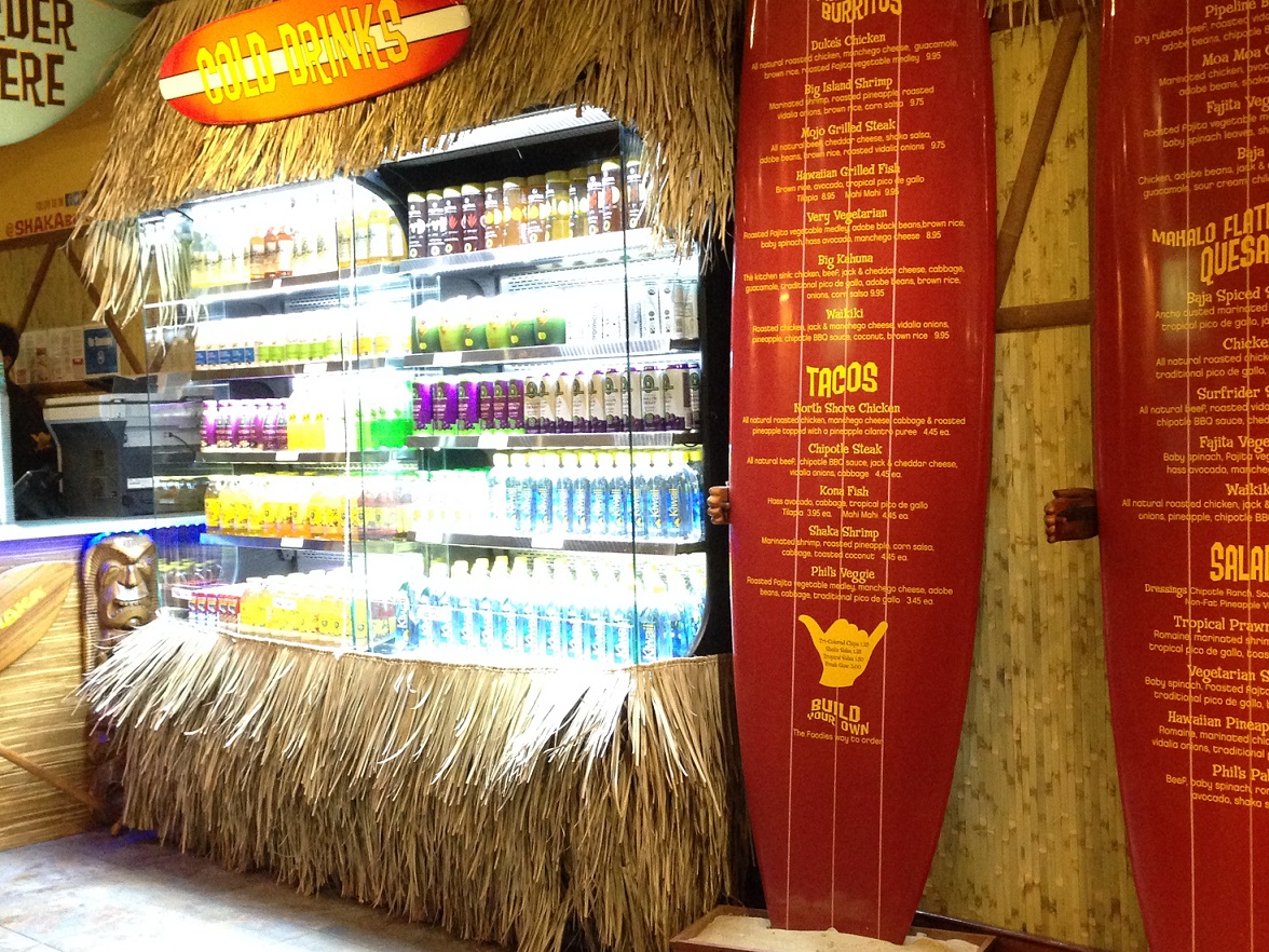 Shaka is really committed to the Hawaiian surfer/beach theme. With surf boards displaying the menu and a tiki hut like drink display…