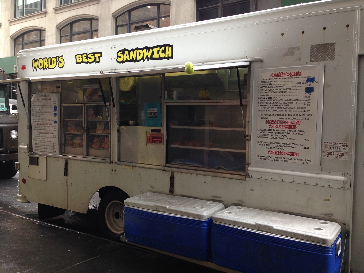 Last week in the cold, I went to find the World’s Best Sandwich truck which a friend around the corner said I should check out. Part of me figured that if it really was the World’s Best Sandwiches (or even one of New York’s top trucks serving sandwiches), I would have heard of it already. But it was at least worth a visit.