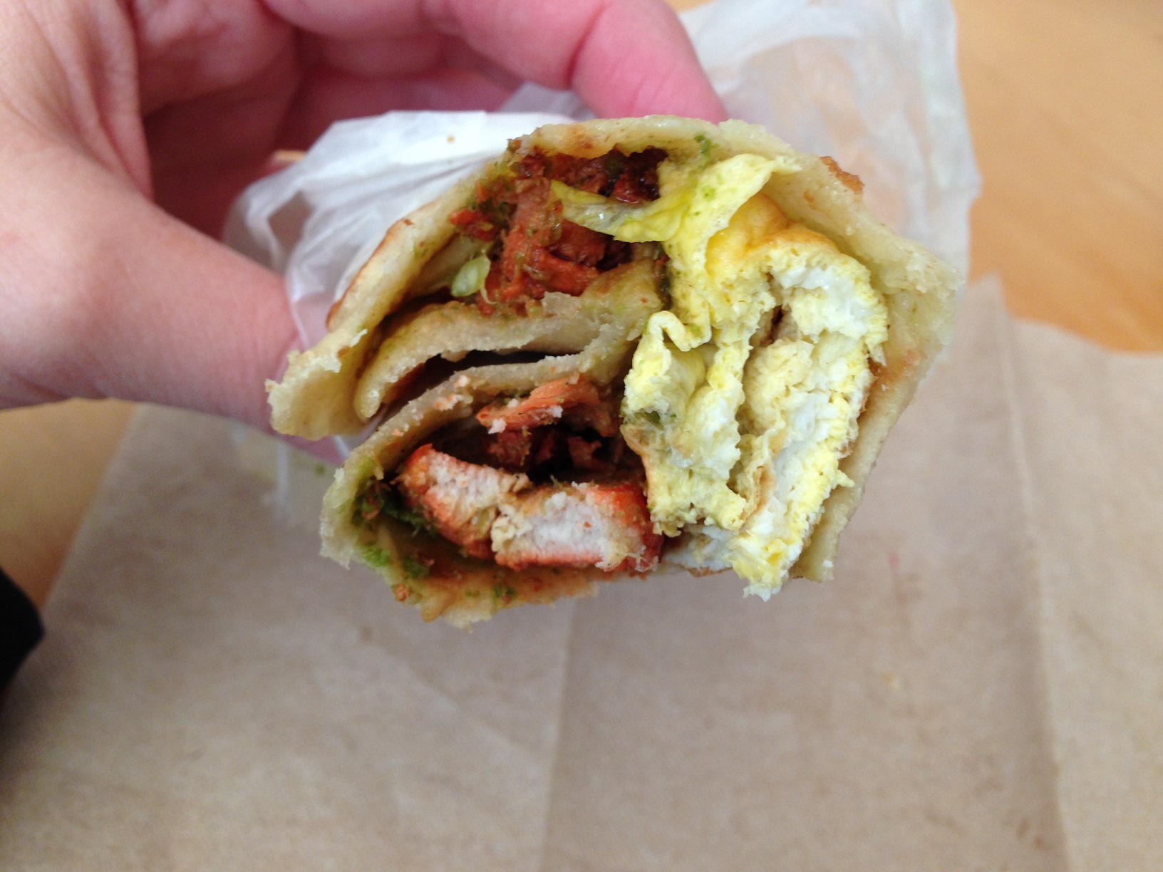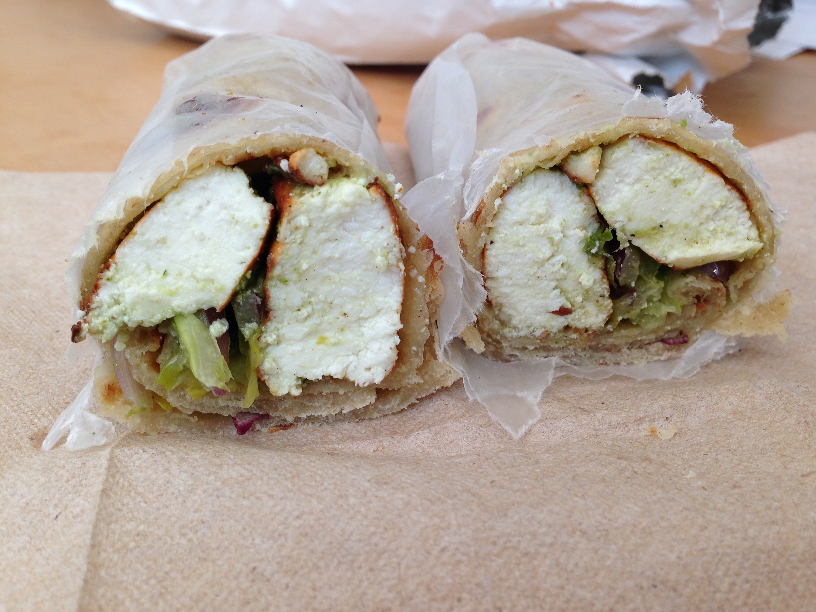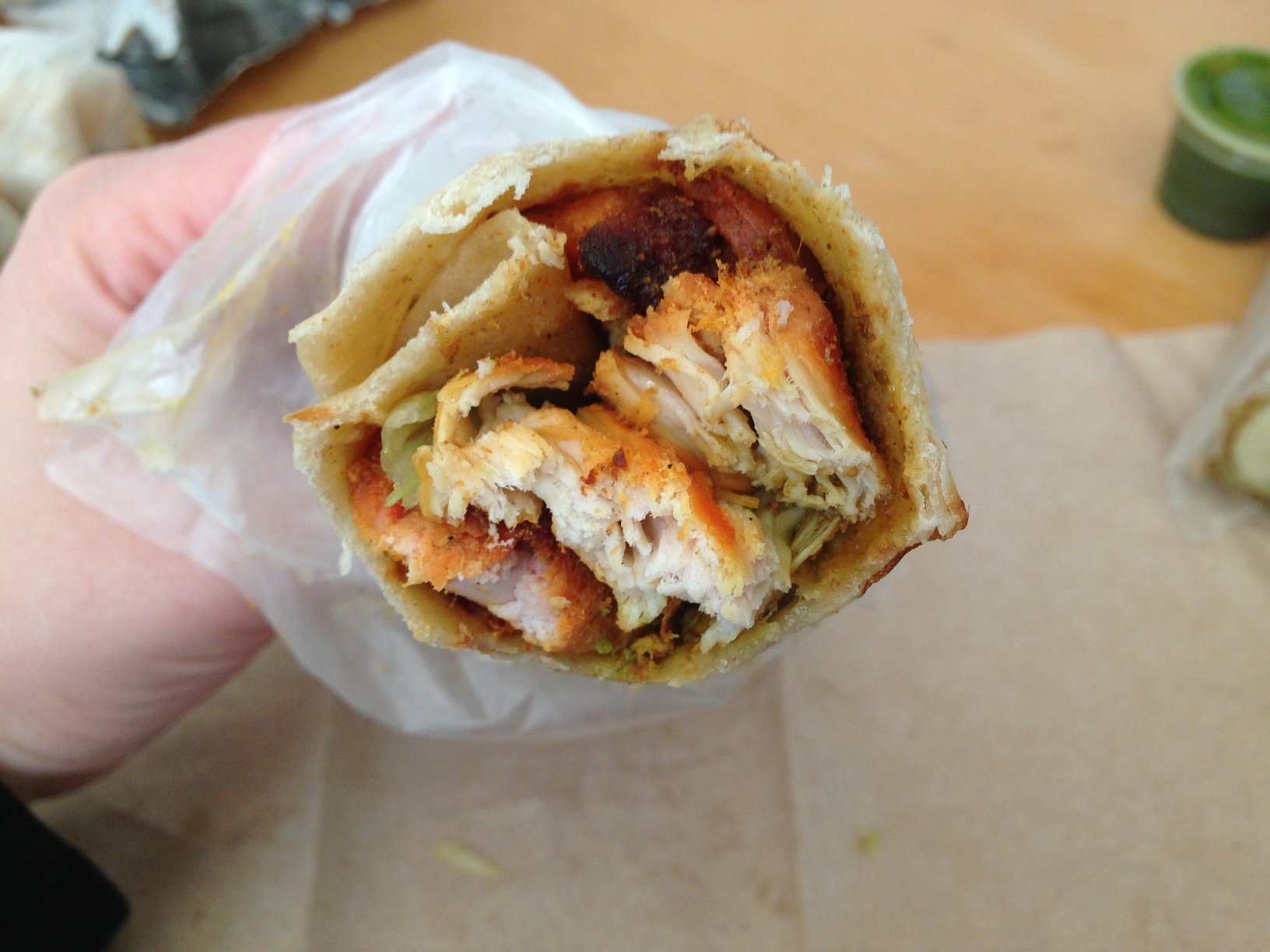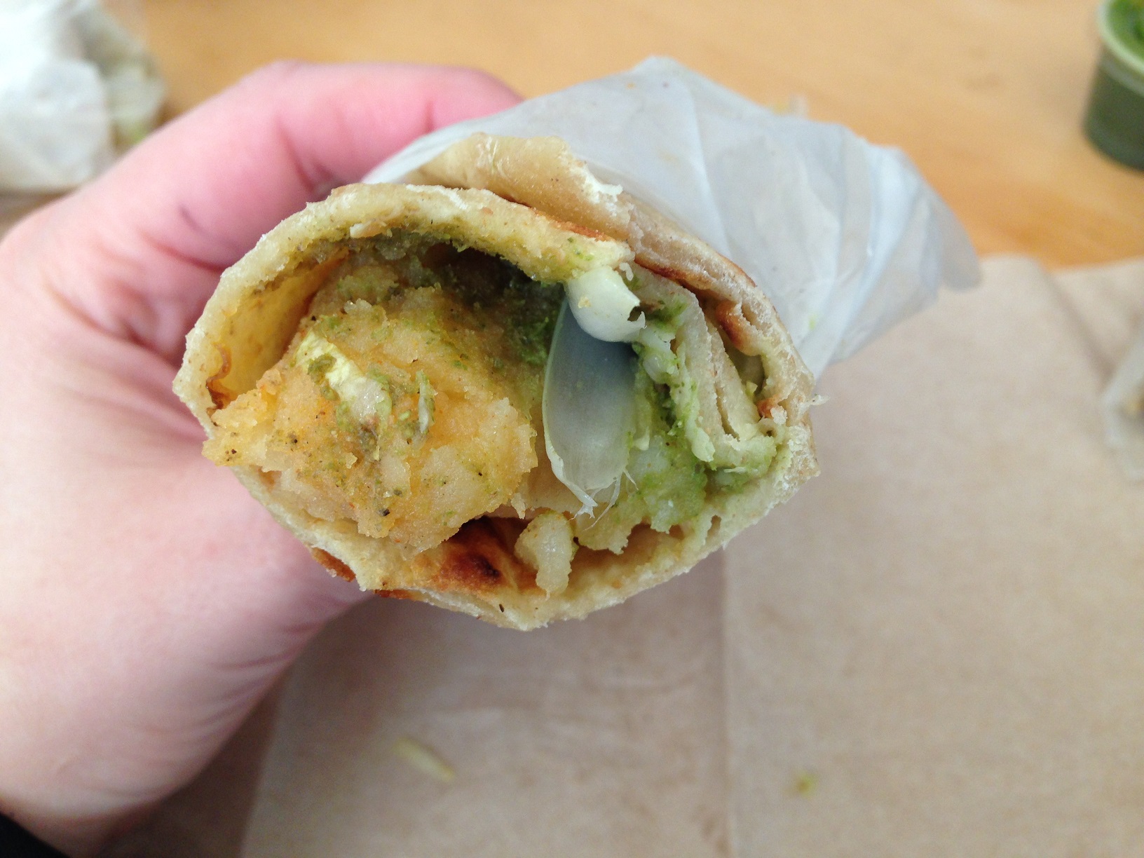 After mentioning that I like it spicy, the guy taking my order suggested the aloo masala. I thought the potatoes were well flavored (and a little more spicy than the other rolls), and I would order it again.