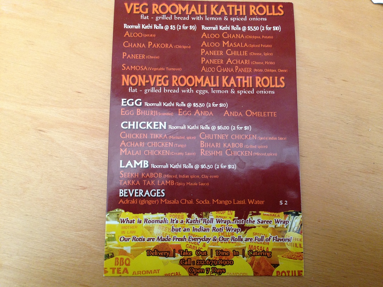 Previously, I walked by and checked out the menu, but I must have forgotten that they serve kathi (or kati) rolls, because I would have been here months ago. The interior is a little hole-in-the-wall like, so some might prefer to take their rolls to-go.
