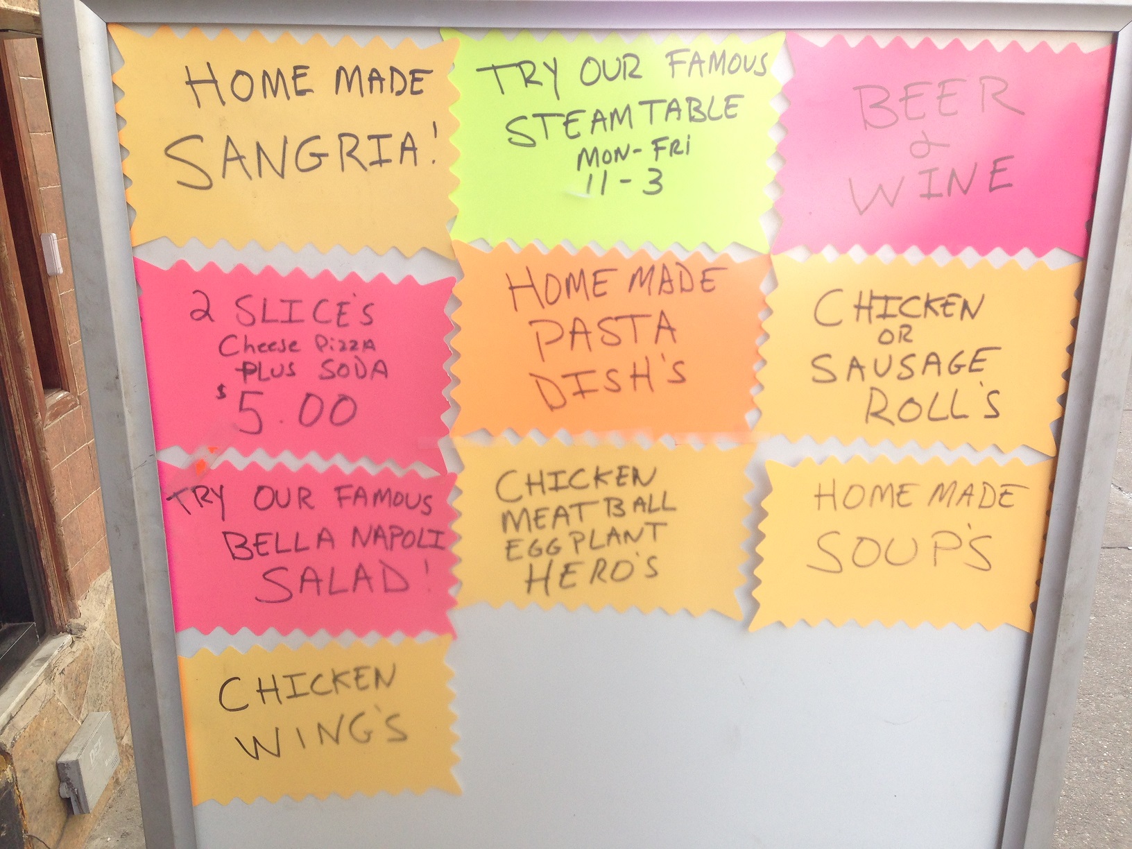Bella Napoli’s neon paper signage encouraging me to “Try Our Famous Steam Table Mon – Fri 11-3” worked and brought me in. Bella Napoli has already made appearances on ML due to their grandma slice, pizza, and $5 anniversary lunch special at their location on 49th Street btwn 6th and 7th Aves.