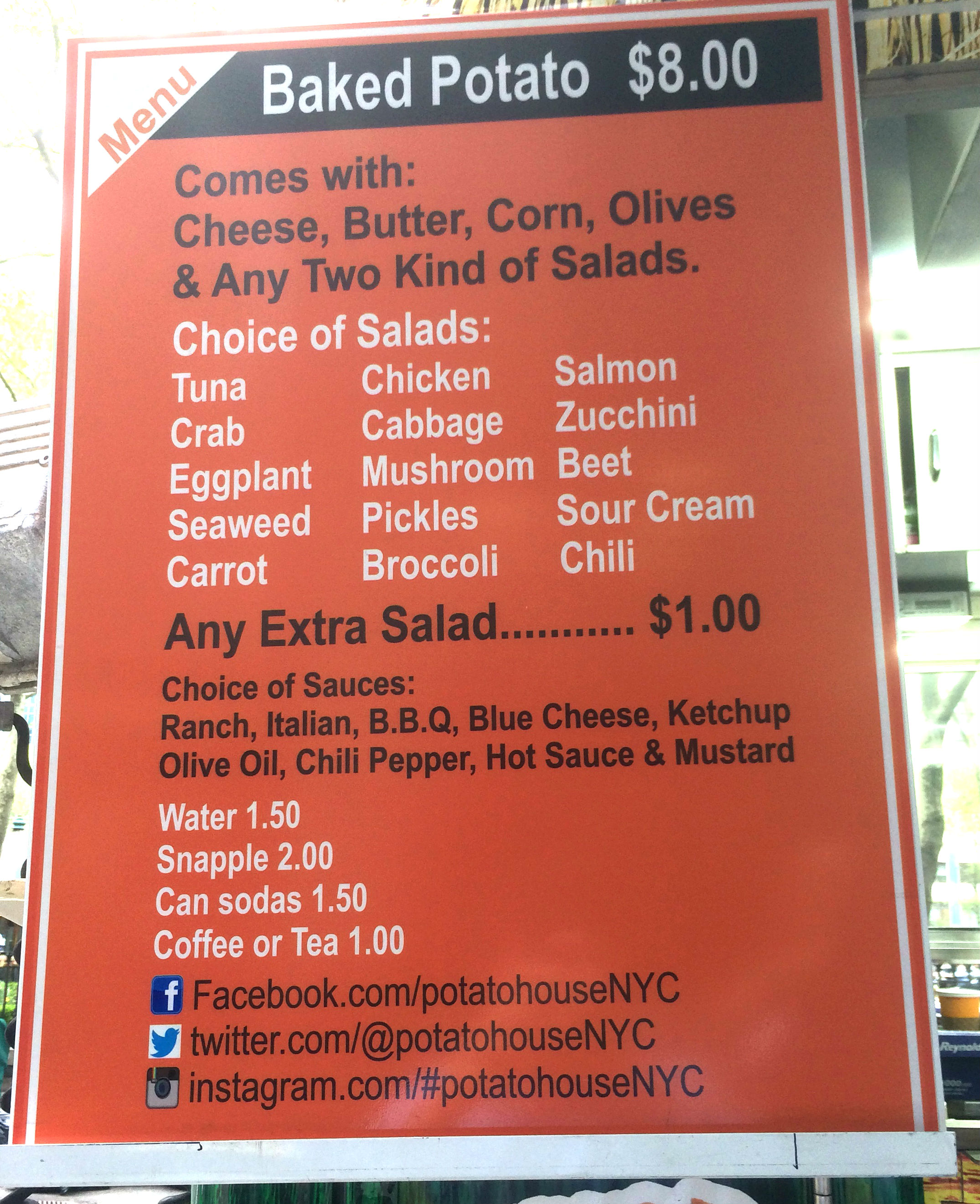 Last week, I was making my way to Zeytinz for lunch when I spotted a new (at least to my knowledge) food truck parked along 40th, right across from Bryant Park. It was the Potato House truck, and this was the first time I had heard about Potato House at all, so I stopped and looked over the menu. They had the usual toppings, like chili, sour cream and broccoli, but they also had toppings like crab, seaweed and beets. Not sure what to think about this new cart, I continued on my way to Zeytinz and began searching the interwebs for any additional information I could find. There wasn’t much (aside from this early spotting back in Sept when they were just a cart), so with my Zeytinz sandwich in hand, I made my way to Potato House to see what it was all about.