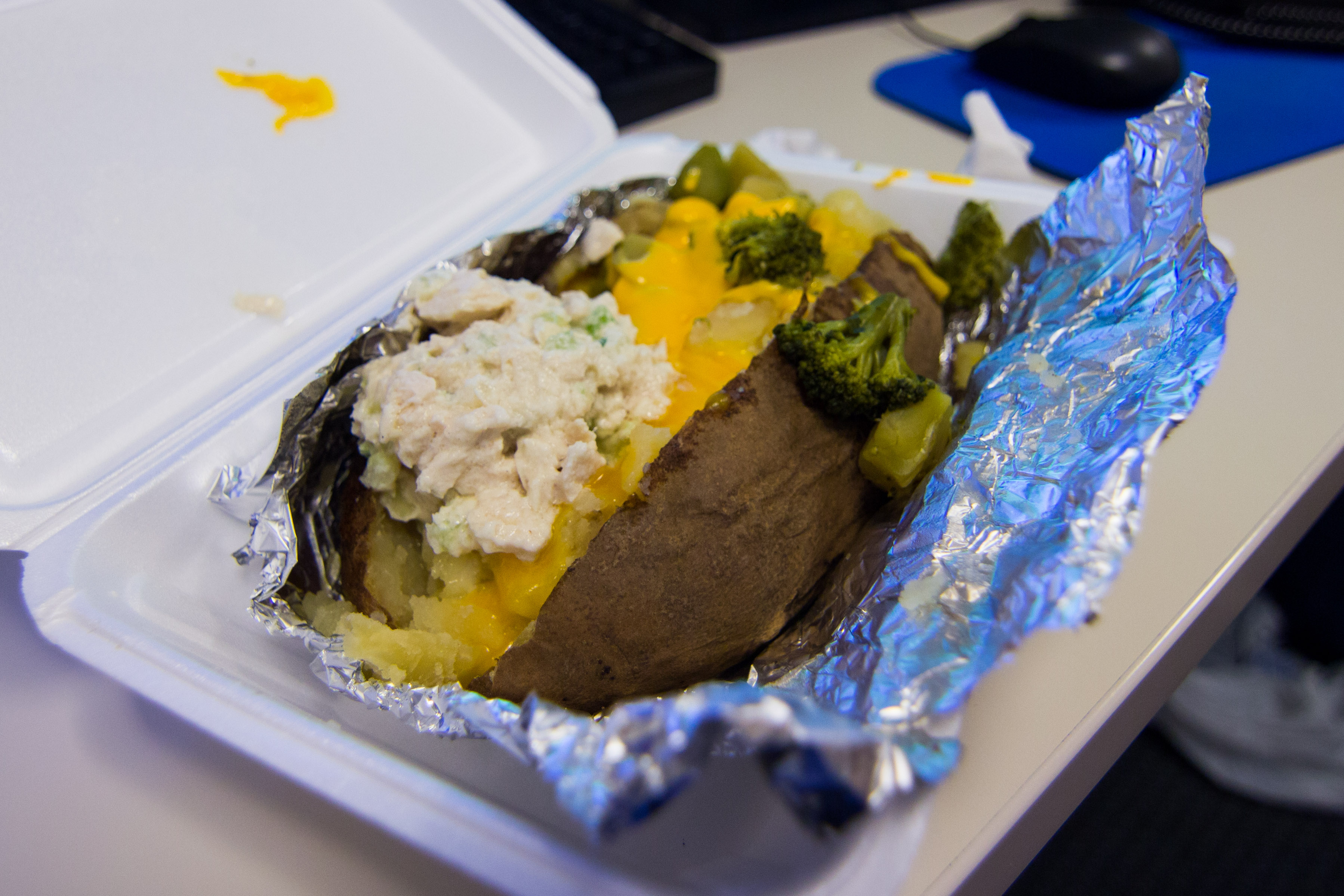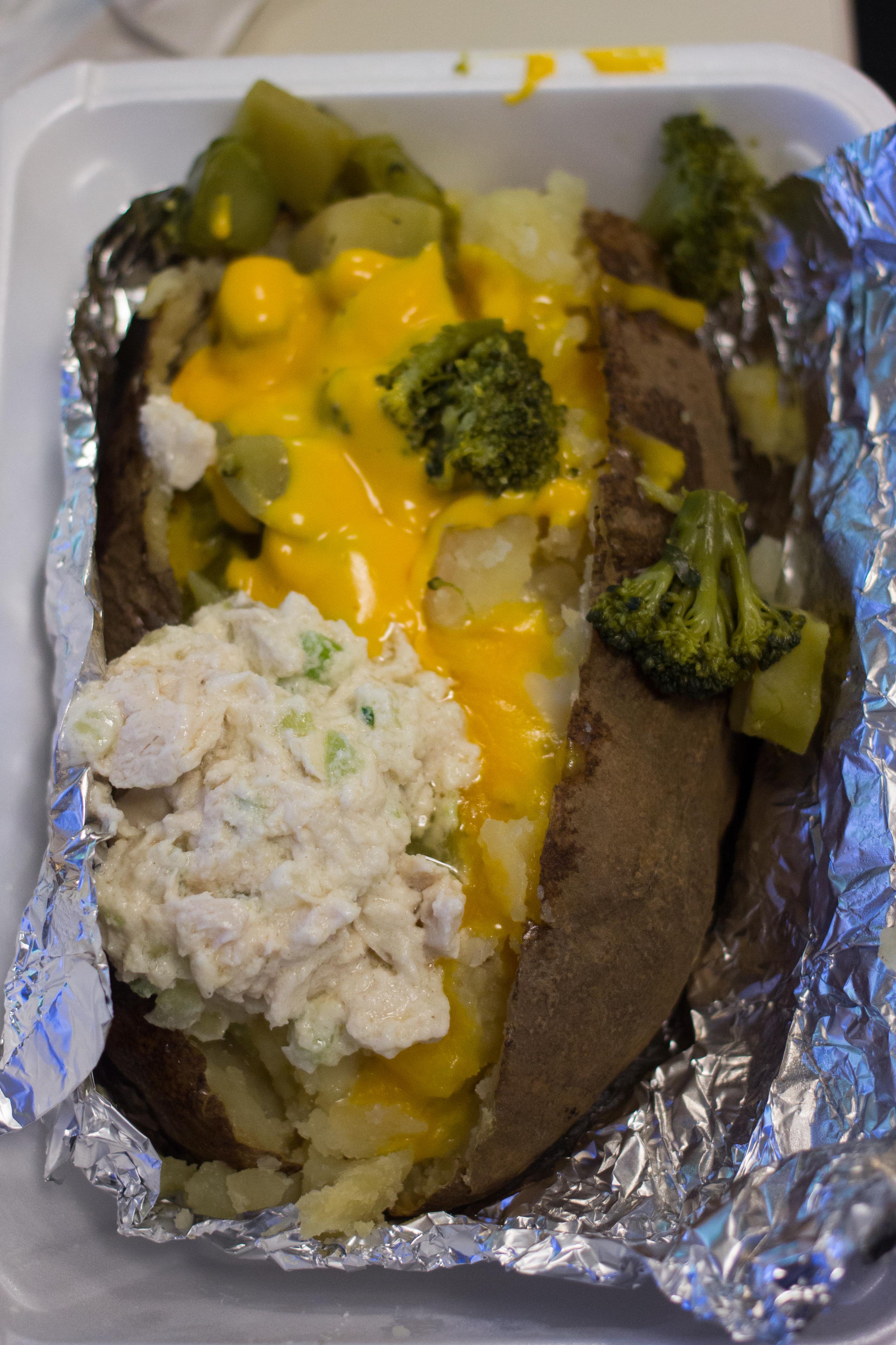 I opted for broccoli and chicken, I’m not really sure what I was thinking. Before I realized what was happening, the employee was dumping liquid cheese all over my potato. Again, it doesn’t say on the menu, but I guess the broccoli automatically comes with melted cheese – this earned Potato House a few points in my book. She then scooped up a serving of chicken salad and placed it on the potato. The chicken didn’t look particularly appetizing, but I wasn’t about to judge a book by its cover.