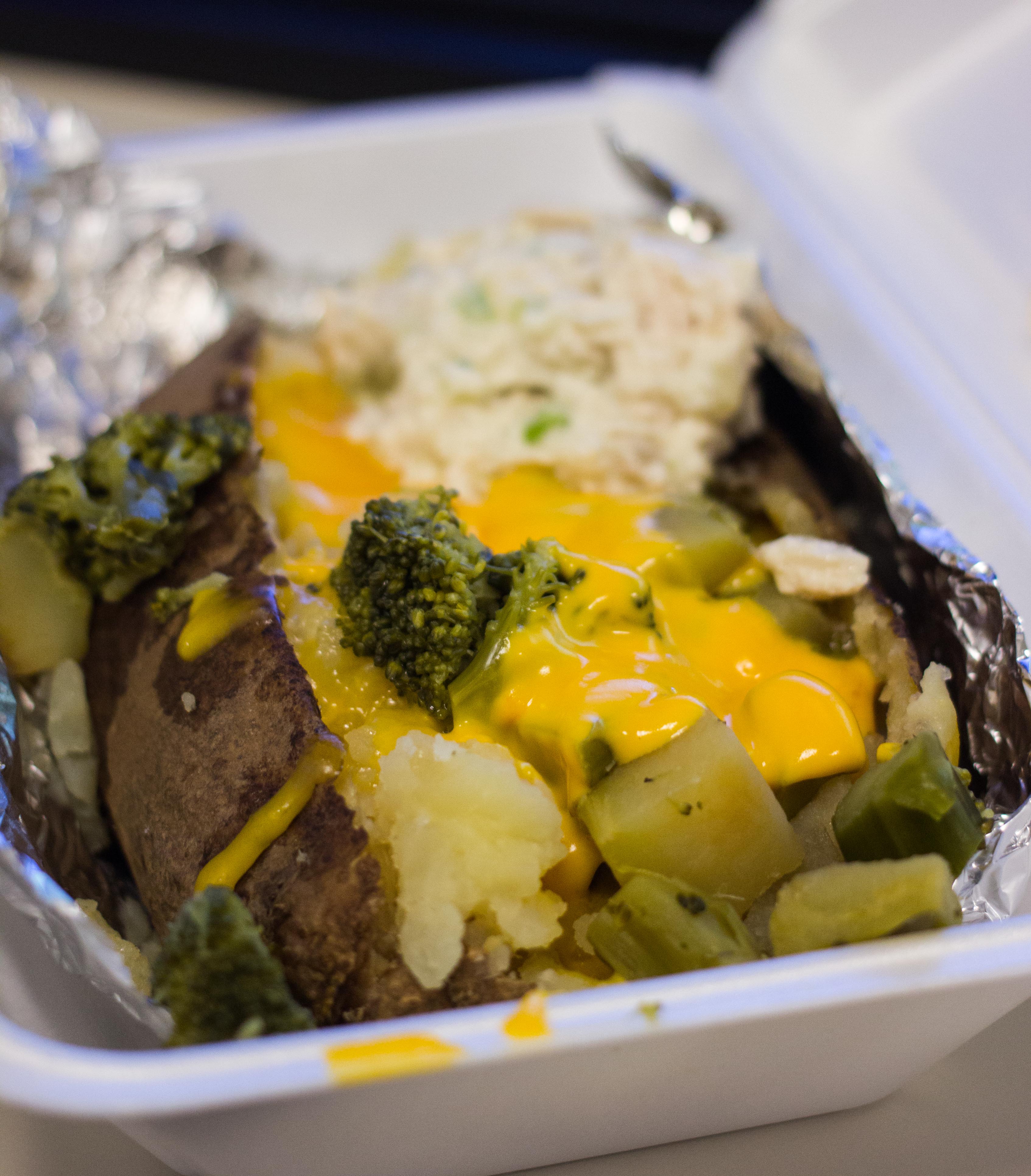 Looking over the menu, I didn’t really know where to start. I certainly wasn’t about to eat my potato without butter (this is America, right?), so I ordered a potato with butter to start. The employee in the truck hastily informed me that that all potatoes came prepared with butter, although their menu doesn’t make that very clear (but it does specify that butter is included in the $8). Then, you get to pick two “salads”, which as we mentioned in a previous write-up, are just toppings.